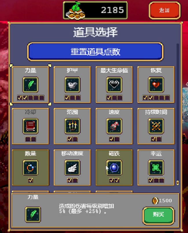 相关阅读 吸血鬼幸存者第一关攻略一览-吸血鬼幸存者怎么过第一关 吸血鬼幸存者死神boss击杀攻略-吸血鬼幸存者击杀死神方法 吸血鬼幸存者超武获取方法讲解-吸血鬼幸存者五芒星超武怎么获得 吸血鬼幸存者游戏道具解锁介绍-吸血鬼幸存者大蒜配什么是黑洞 吸血鬼幸存者游戏道具攻略-吸血鬼幸存者如何找到石面具 吸血鬼幸存者复制器装备介绍-吸血鬼幸存者复制器可以复制什么 吸血鬼幸存者解锁诅咒方法介绍-吸血鬼幸存者怎么加诅咒 吸血鬼幸存者符文追踪器获取途径解析-吸血鬼幸存者怎么获得符文追踪器 吸血鬼幸存者护腕解锁步骤介绍-吸血鬼幸存者护腕怎么解锁 吸血鬼幸存者游戏道具获取攻略-吸血鬼幸存者四叶草怎么获得