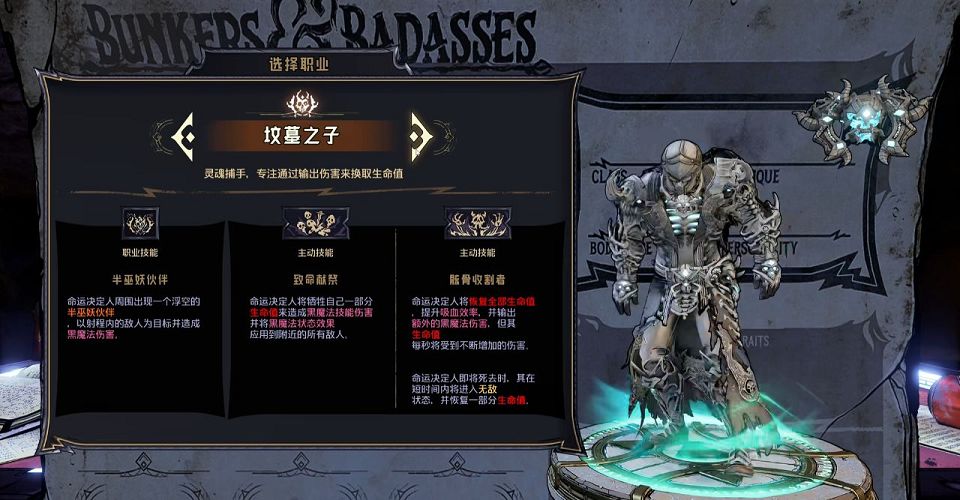 这个职业在游戏中可以召唤出来一个半巫妖伙伴,不同于孢子游侠的蘑菇伙伴,这个办五幺伙伴可以造成远程的魔法伤害。坟墓之子最大的特点就是释放主动技能会扣除自己的血量,但是会对周围的所有敌人造成黑魔法伤害,不过你也不用担心坟墓之子的存活能力,因为他的另外一个主动技能能够恢复全部生命值,并且提高吸血效率,如果还感觉不够的话直接给你来个无敌免疫死亡,这还不变态吗。