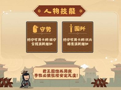 李牧的两个技能分别是守势、围歼,同时可以获得两张技能卡片,分别是据守、伏兵,两张主动技能卡并非是进攻类型,有些类似防守反击使用。据守能让区域性的士兵获得更高的防守,而伏击可以在自己的作战区域内释放伏兵。