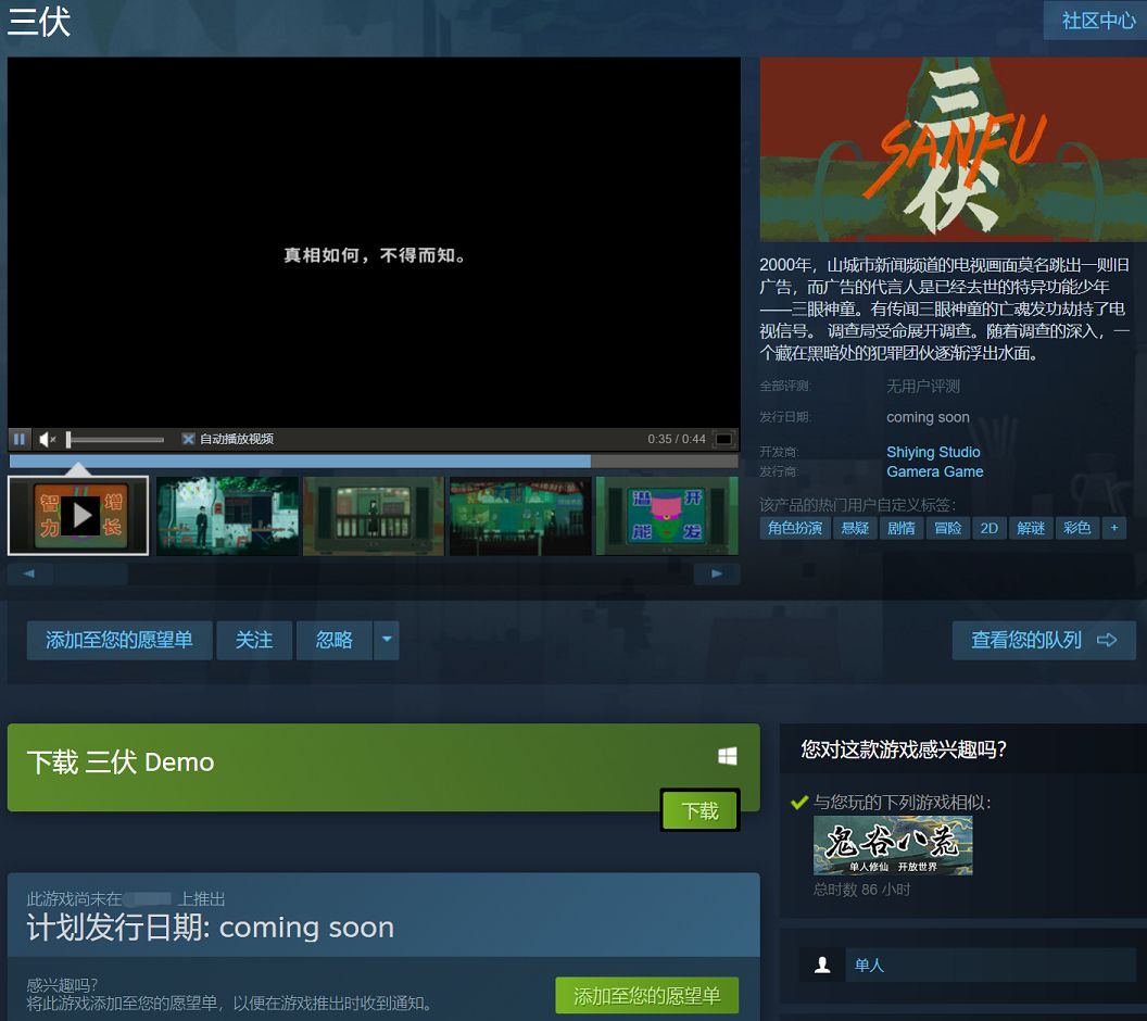 三伏的demo是在2022年的3月20日左右开放下载的,而demo下载的下面就是计划发售日期,这里写着coming soon,所以在短时间内是肯定不会发售的。另外这款游戏的创作者最近也被采访了一下,他透露了一下这款游戏会在2023年发售,但具体的日期没有说,小编认为最迟也不会迟于5月份,小伙伴们可以耐心等一等。
