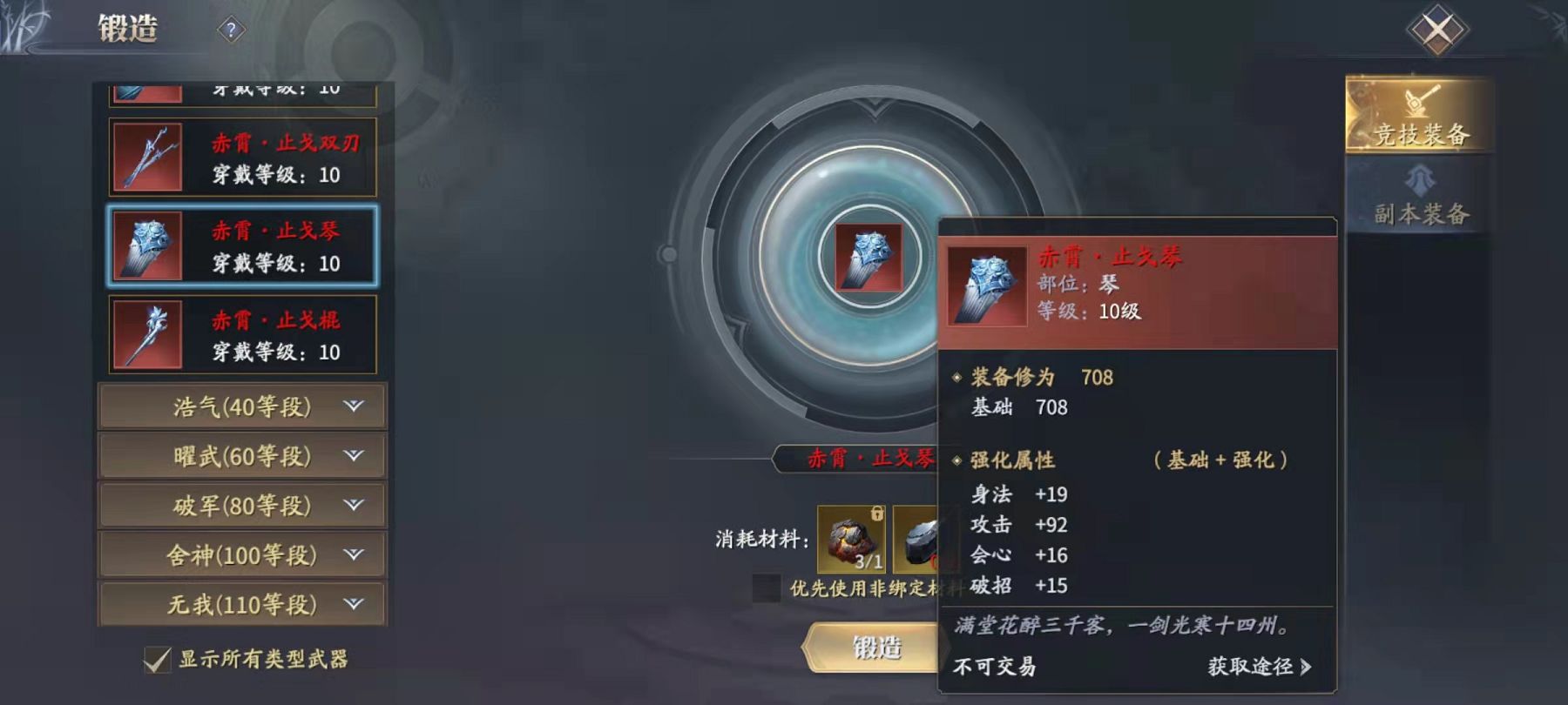 选择好了武器类型,最后一步就是找一把合适的武器,目前可以获得装备的途径主要有锻造、副本掉落、商店购买等。但是要想获得第2把武器主要还是通过锻造,消耗天脉奇玉和玄天寒铁就可以打造出武器。