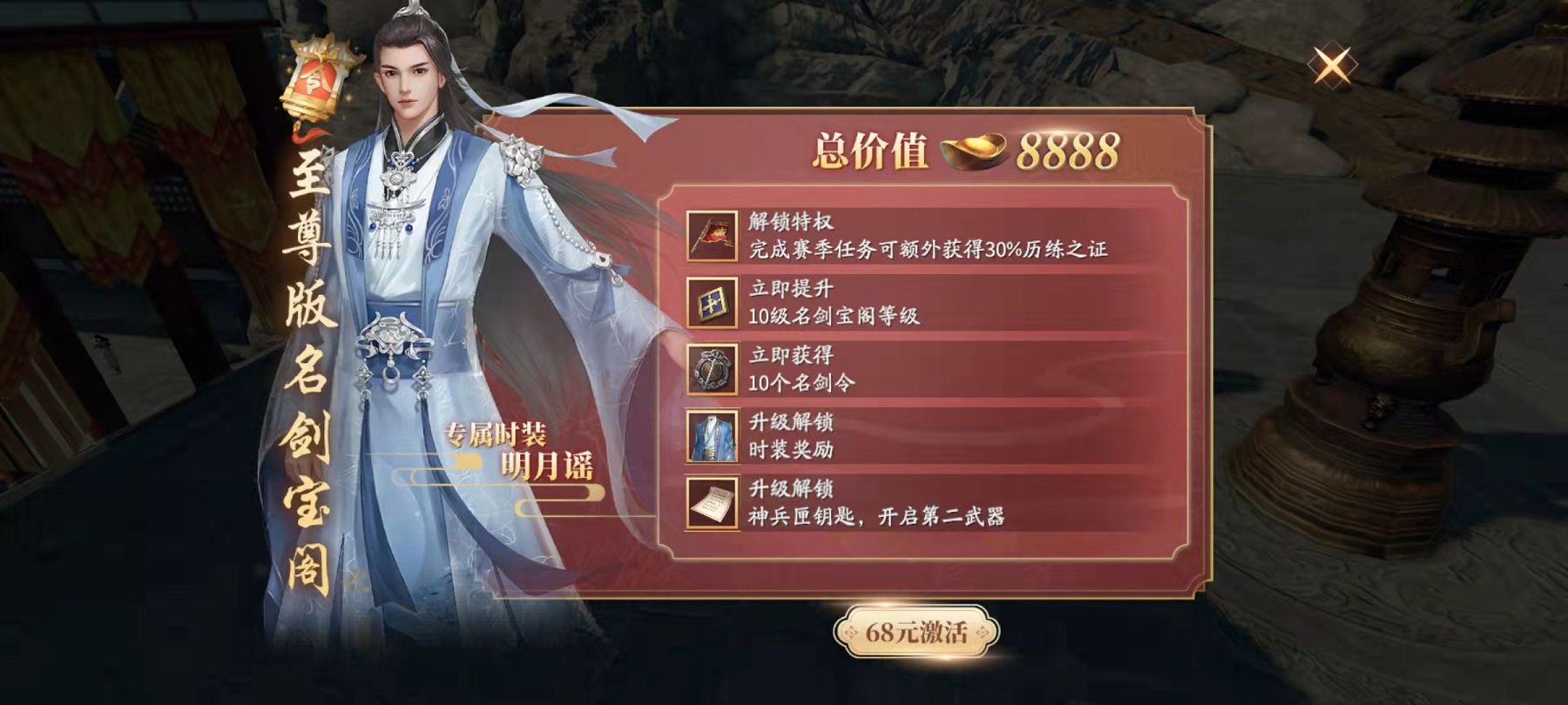 要想实现切换武器,就必须先将自己的人物激活第2件武器的栏位,目前激活的方式是需要获得神兵匣的钥匙,然后使用钥匙来解锁第2件武器。获取神兵匣钥匙的方式只有在奇珍阁里的名剑宝阁中,激活至尊版特权之后奖励。激活至尊版特权需要68元,但是小编认为这是非常划算的,因为除了可以解锁第2把武器外,还有额外获得经验的特权,还会奖励各种时装和名剑令等。