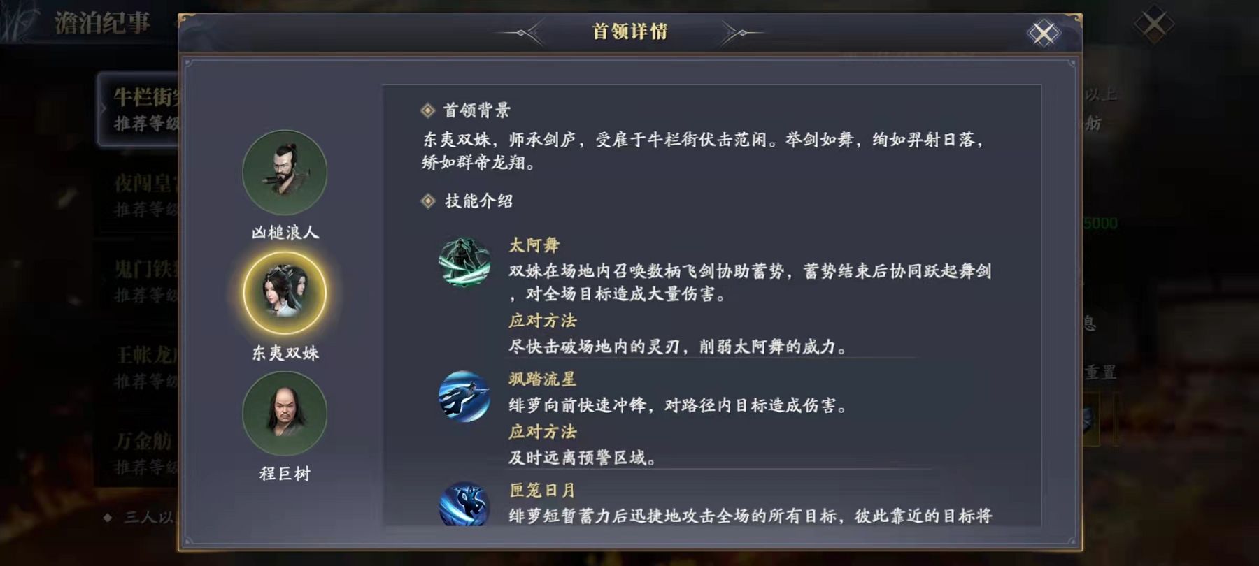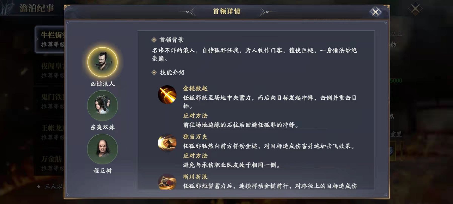 牛栏街副本是儋泊记事中第一个副本,玩家等级达到40级就可以去挑战,在硬件方面每一个队员修为最好达到15,000以上,人数在三个人以上最好加满。牛栏街副本中一共有三个boss,分别是浪人任孤邪,东夷双姝和程巨树。