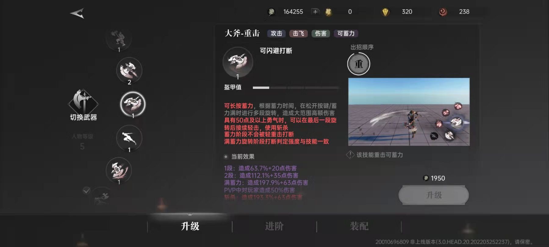 剩下的连招需要在勇气值达到50点以上时触发,长按大斧子的重击技能可以进行蓄力,当松开按键蓄力的时候,可以造成多段的旋转伤害。需要注意的是等到伤害触发达到最后一段的时候需要接上一个轻击,这样可以触发斩杀效果。