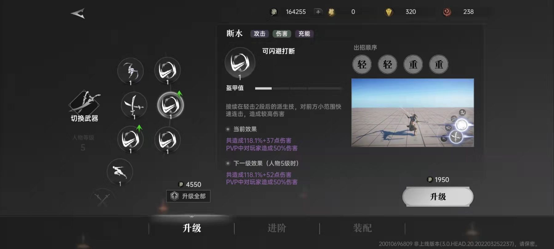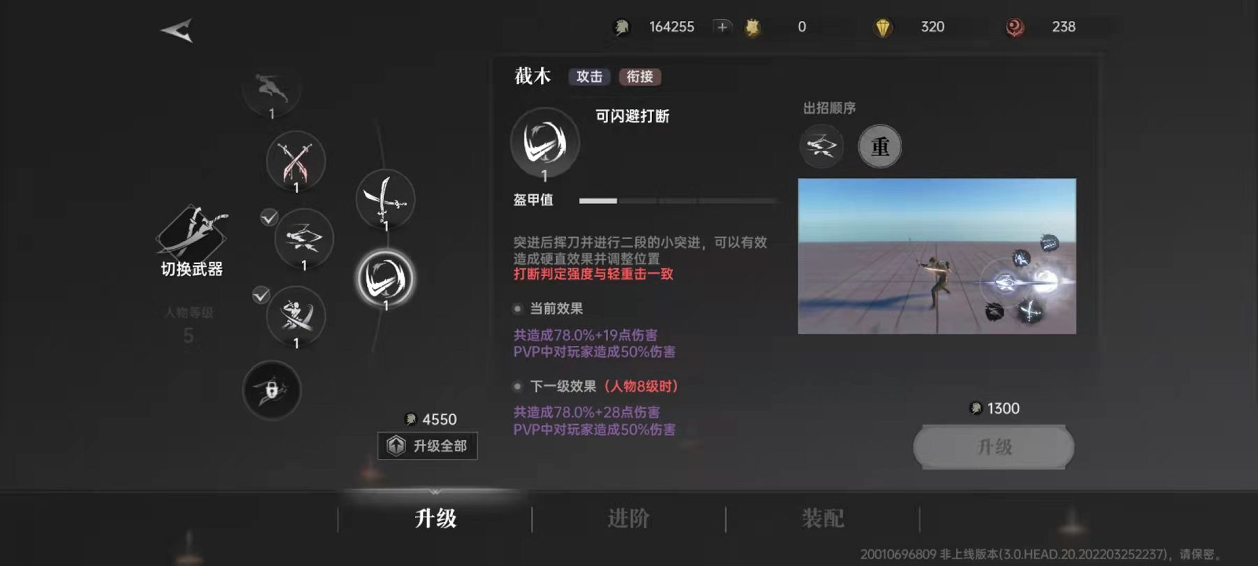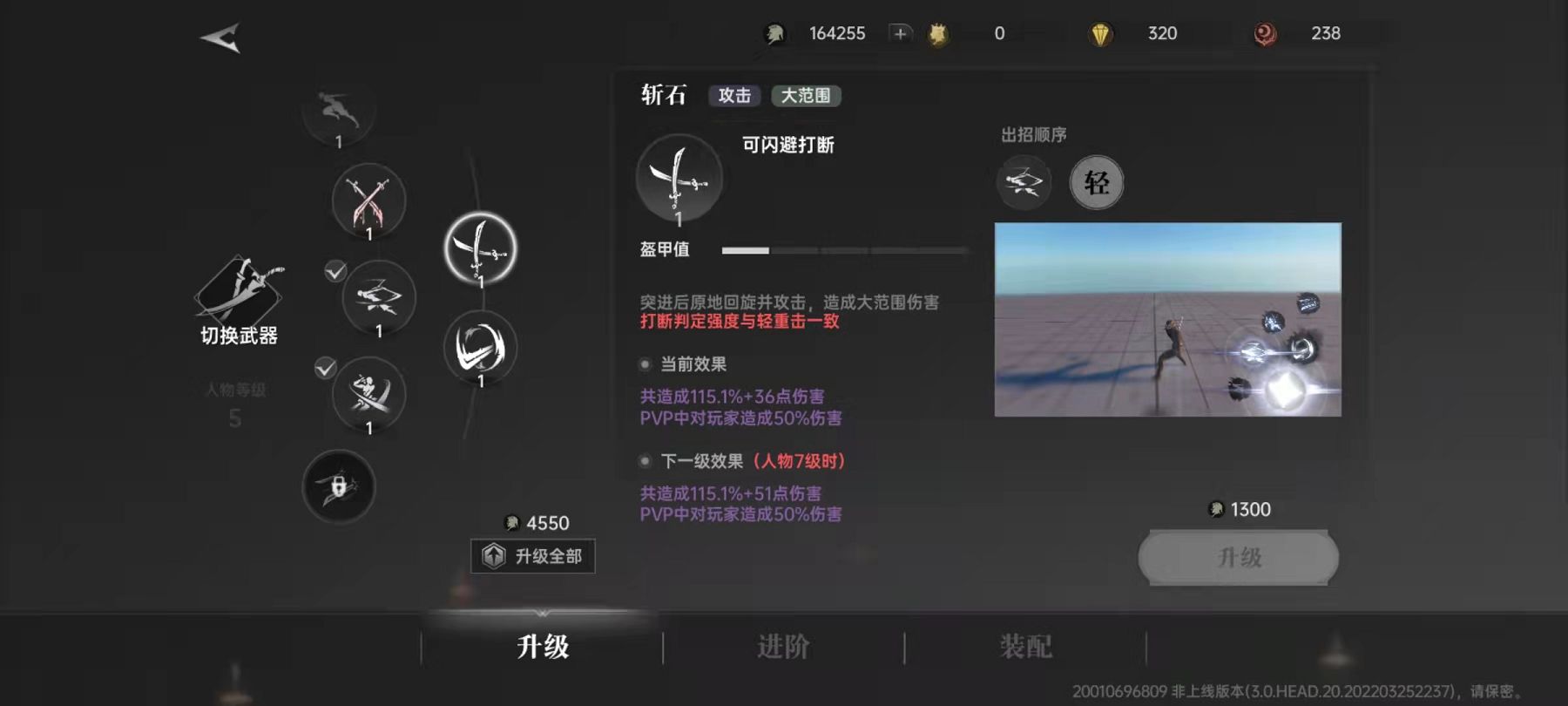 第4个连招是回转,可以快速向前方打出伤害,拥有非常短的后摇,出招的顺序是重击、轻击。第5个连招是升龙,可以将小范围内目标打出浮空效果,出招的顺序是重击、重击、轻击。除了轻重攻击触发连招外。闪避技能加上清真技能也可以触发连招。第6个连招斩石,可以在突进后原地回旋并且攻击,造成大范围伤害,连招的顺序是技能长驱直入加上轻攻击。