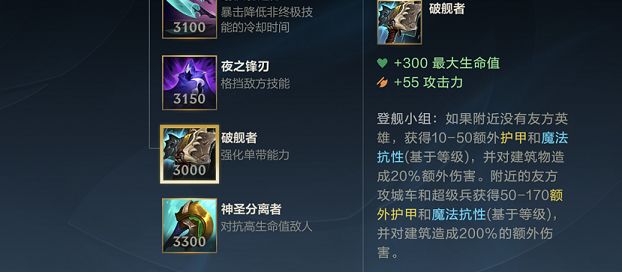 版本新增两件装备,分别是“神圣分离者”和“破舰者”。神圣分离者适用于战士英雄,是一件综合能力很强的装备,可以造成额外伤害和恢复生命值。破舰者适合单带类英雄,在附近没有队友时可获得额外的双抗。