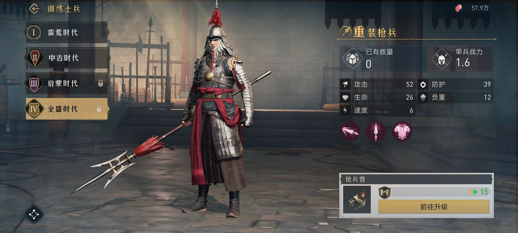 枪兵在游戏中克制骑兵,大部分枪兵的基础血量和伤害都是比较高的,而且枪兵的制作成本比较低,相对来说在四大兵种中属于攻防均衡的一个,在战斗的时候喜欢聚成枪战来抵挡骑士的冲锋。