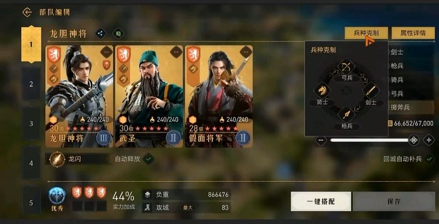 弓兵在游戏中克制的是剑士,这个兵种是四大兵种中最脆的一个,而且攻击频率比较慢,但是每次攻击都能够让剑士掉百分之七八十的血量,尤其是有一个好的武将将领的加持下,基本上能够一波秒掉剑士阵容。