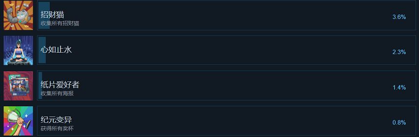 最后是两个比较麻烦的成就:“招财猫”和“纸片爱好者”,这两个成就需要我们收集所有的招财猫和所有的海报才能够解锁。建议大家在商店先购买对应的收集道具,通过收集道具可以精确定位地图上招财猫和海报的位置,这样可以极大地降低我们获取它们的难度。同时,由于地区解锁问题,大家最好在主线结束后再进行这两个成就,可以有效地避免地图导致的限制。