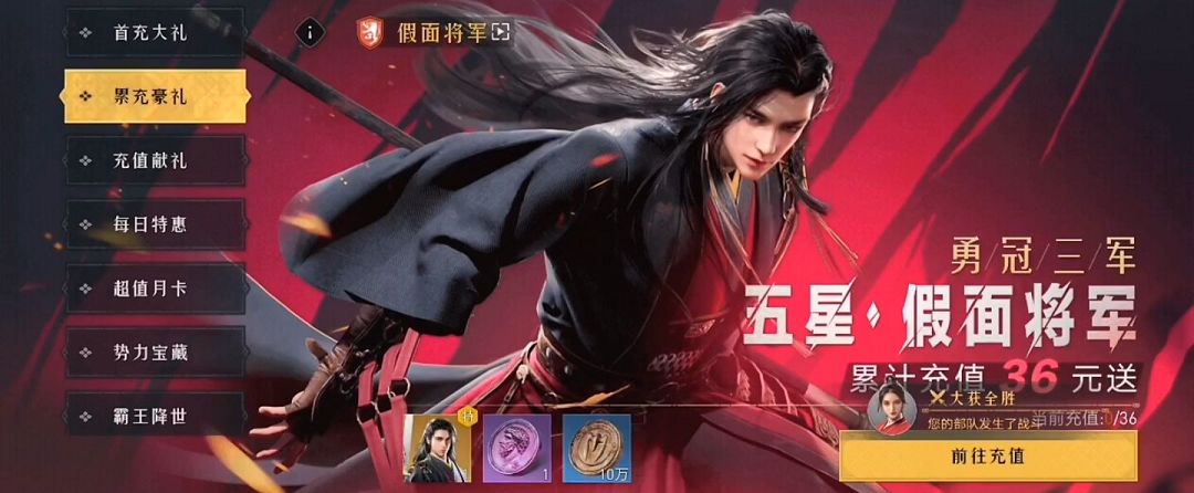 如果真的打算在这款游戏里面微微氪金的话,那么充值36元就能够在游戏中的发育历程有一个质的变化。最关键的还是兰陵假面这个英雄的获取,可以配备强力的骑兵队伍,在战斗的时候如果再搭配上关羽就是一个强力的骑兵追击队。