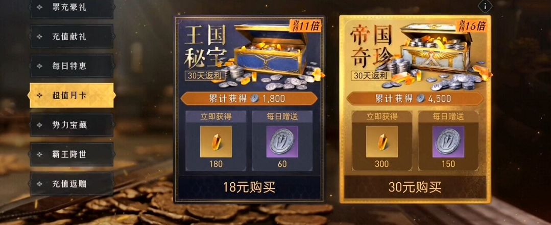 以上就是关于重返帝国礼包买哪个好的所有内容了,这是一款相对来说还是比较氪金的游戏,但目前从四次测试来看里面的游戏内容不管是从帝国风格还是高自由度的玩法还是很值得大家氪金的。