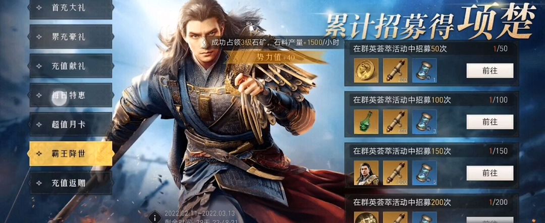 基本上这类养成策略类的游戏都是需要慢慢积攒资源的,花费48元就可以将月卡礼包全部拿到手,总共可以获取6300个帝国币,能够为大家带来十次十连抽的机会,这样就能保底出五个橙色武将,这样就能有一套稳定的强势阵容了。
