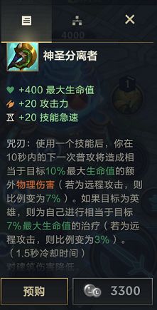 装备俗称神分,在针对坦克时能造成很高的额外伤害,尤其是目标最大生命值越大,装备提供的额外伤害就越高,计算的数额为10%,造成伤害之后还可以依据对方血量7%来进行恢复。从基础属性来看,这件装备也是属于战士类英雄出的,比较适合的英雄有青钢影、猴子。