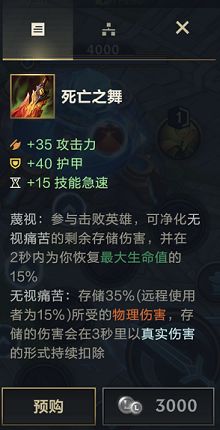 死亡之舞算属于进行了一次小改版,合成路径、价格、属性、被动都调整了,如果说能够参与完成击杀,所受伤害的存储量消除,反倒是会为自己恢复15%的最大生命值。黑色切割者在新版本性价比下降严重,技能CD由原先的25降低到20,大幅度降低了前期的作战能力。
