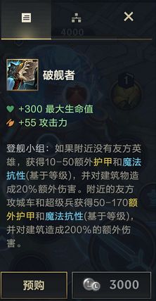 破舰者是一件专为拆塔而生的装备,如果周围没有队友的话,能够获得双抗的提升,并且还能将小兵进行强化,且对防御塔多造成20%的伤害。装备的售价为3000,能够提供300最大生命值和55的攻击力,适合英雄有蛮王、剑姬、小炮等单带、推塔能力强的英雄。