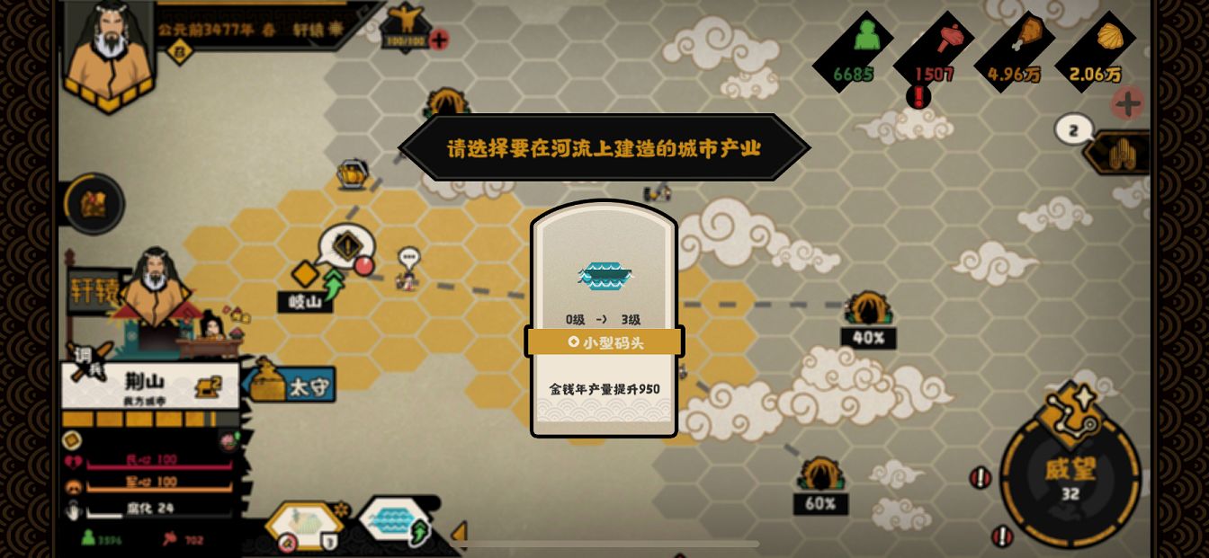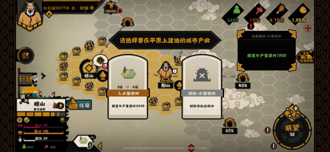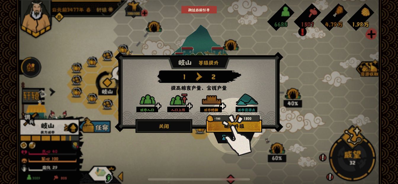 升级城池需要对应的资源,事先点击你需要升级的城池,满足升级条件之后,左下角的标志后面会带一个上升的标志,此时玩家就可以对城池进行升级。前期升级基本都是麦田,后期的话就到了民居、军营、农田等,但每次升级都会获得相应的驾乘。