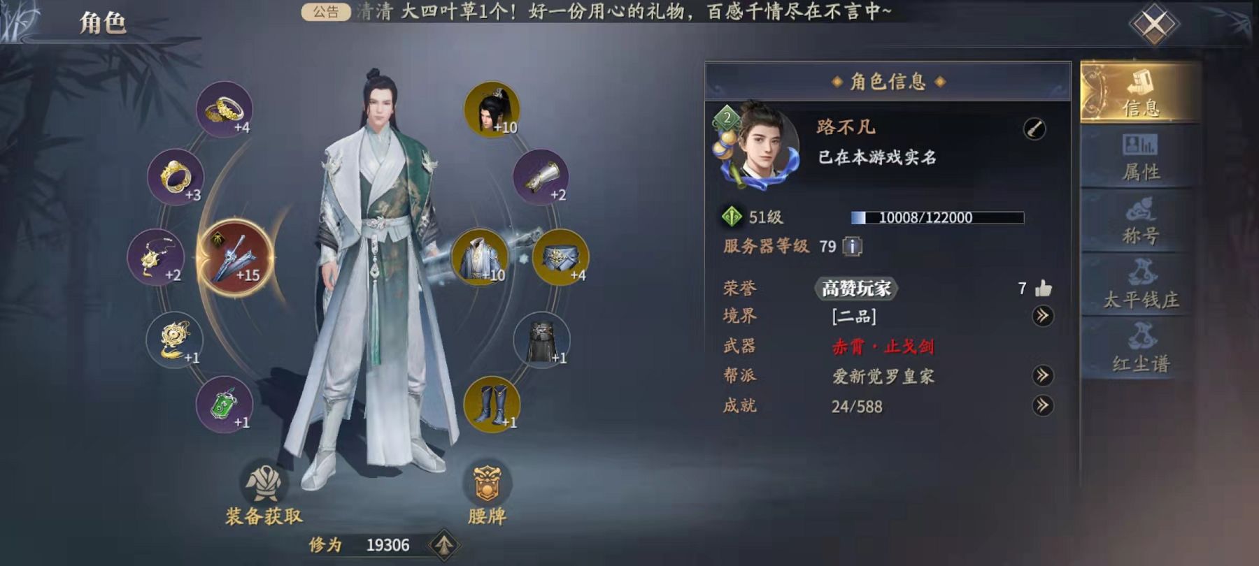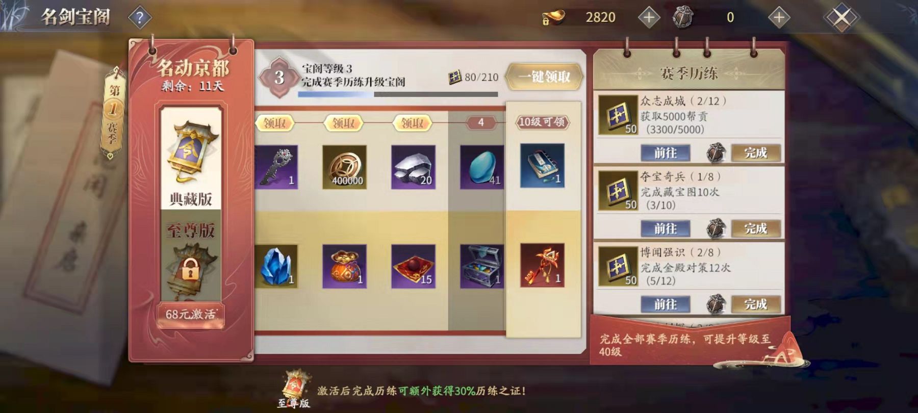 想要获得第二武器的栏位,我们需要在界面中的珍宝阁里选择名剑宝阁,然后花费68元激活至尊版的名剑宝阁。激活之后获得的特权里就有神兵侠的钥匙,使用这把钥匙就可以开启自己的第二武器。当激活之后就可以在自己的装备栏主武器的旁边看到第二件武器的位置。