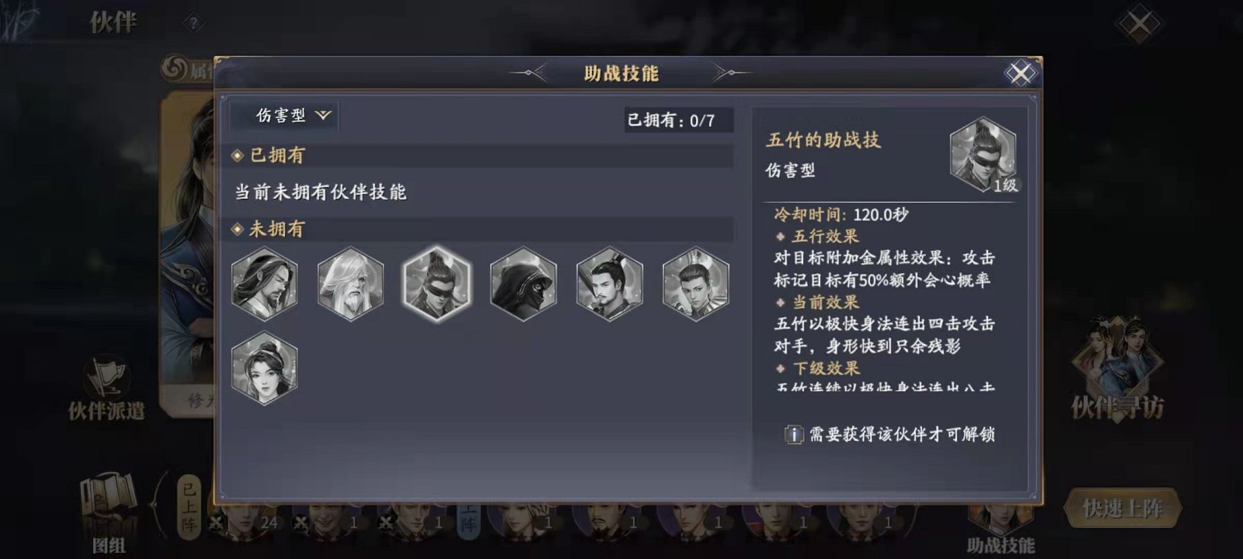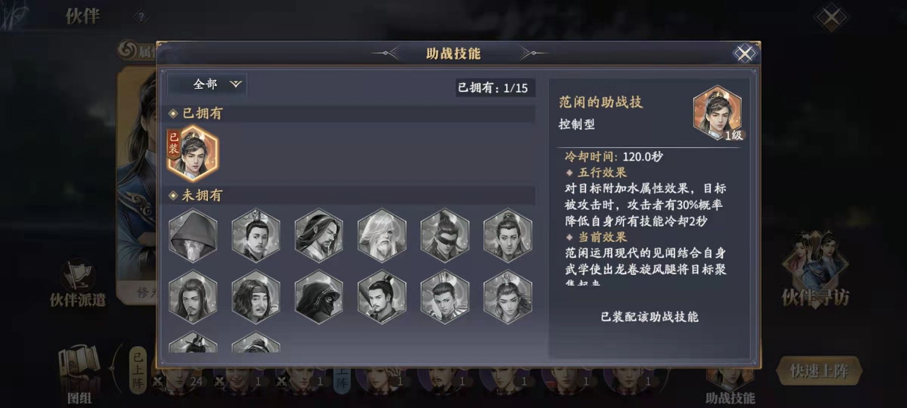 五竹的助战技能是金属性效果,可以标记对方,当人物角色攻击被五竹标记的目标时,有50%的几率可以产生额外的会心效果。所以五竹非常适合暴力输出型的职业选择,而范闲的降低冷却效果则是所有职业通吃。