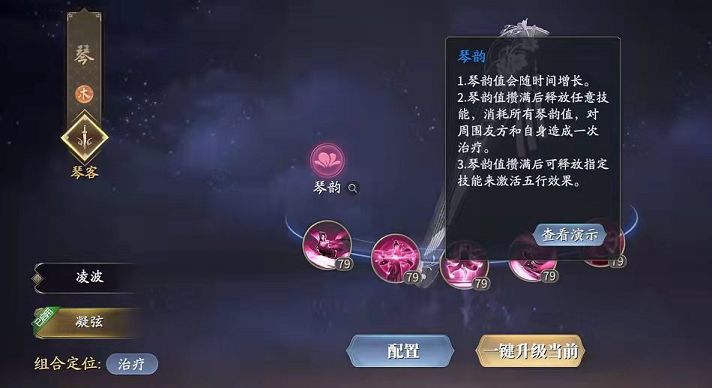 琴最主要的还是自身的治疗效果,自身的琴韵效果可以随着时间增加,当琴韵值攒满之后,无论琴释放任何一个技能,都可以消耗当前的琴韵值,对周围和自身造成一次治疗效果,而且是自动释放的,不需要自己去操作。其他的几个技能中辅助效果也非常不错,例如秋江夜泊这个技能,可以对周围的敌人造成伤害,并且解除我方队友受到的控制效果,同时自身和周围所有的友军都可以获得减伤。