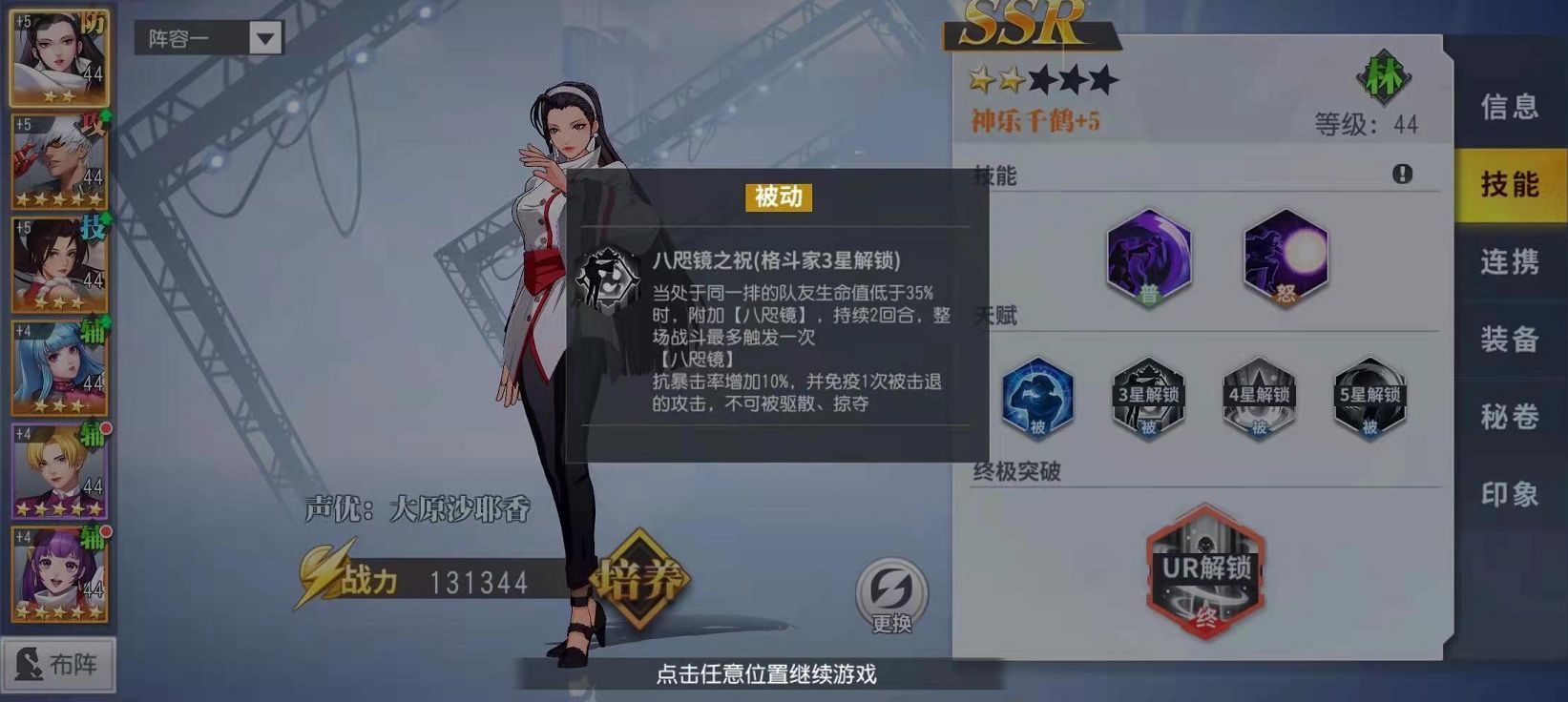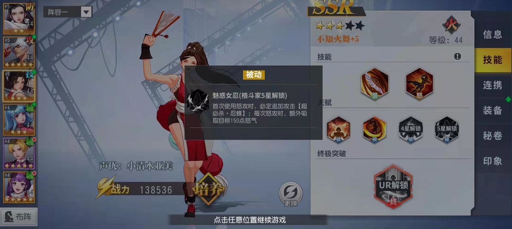 不知火舞是后排输出的核心,需要重点培养,麻宫雅典娜是一个非常强力的辅助。这样整套阵容虽然没有很突出的地方,但是胜在没有短板,无论是打架还是做任务输出非常稳定。而且成型非常简单,平民玩家也可以轻松驾驭。