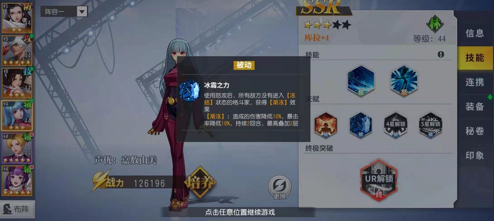 库拉的怒气技能有几率为对方全体附加冻结效果,并且在获得了被动技能加成后,还可以对没有冻结的目标附加渐冻效果,凡是被渐冻影响的目标都会降低输出,这样无论是否冻结,我方都能获得很好的限制输出能力。当对方被控制之后,就轮到荒狂电光夏尔美出场了,可以对敌方全体单位施加惩戒之雷效果,被影响的敌方格斗家受到的伤害提高,如果敌方被限制了行动,那么这一伤害提升效果还会继续增加。