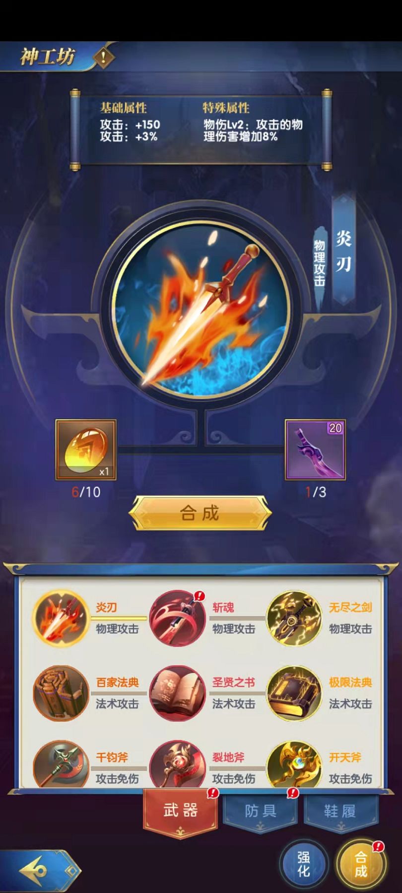 英雄身上的装备分为武器,衣服和鞋子,游戏中掉落武器的地方只有在百族战塔,挑战百族战塔可以获得装备箱,开箱子中选择自己需要的装备类型。初始装备都是紫色品质,然后在神工坊中可以通过金币进行强化,三件相同的武器还可以合成为更高品质的武器,例如紫色的武器流光可以合成为橙色的武器炎刃,再往下合成是斩魂,最后是无尽之剑。其他的装备和武器也是同样的合成原理。所以高级装备需要消耗大量的低品级装备,想要给上阵的6名英雄都穿戴上极品装备难度很大,所以小编建议大家先优先给前排的防御核心和后排的输出核心穿戴上极品装备之后,再考虑其他的英雄。