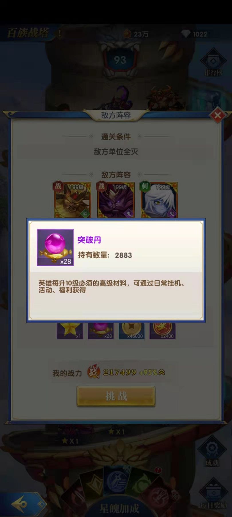 突破丹主要是在秘境中的百族战塔活动中获得,每成功挑战一关可以获得大量突破丹,同时在成就奖励中还有钻石装备等,属于一定要刷的活动。除了等级之外,英雄还可以提升自己的等阶,等阶和等级不同,需要每个英雄自己去提升。消耗的是对应英雄的灵魂石,可以通过在唤灵阁中招募获得,部分英雄的灵魂石还可以在商店中直接购买。再就是每个英雄可以穿戴三件装备,一件神器和一件法宝,法宝是英雄升阶到传说品质之后自动获得的。后期需要购买各种法宝精华为自己的法宝升星,法宝升星之后不仅附加的属性增多,还可以激活法宝天赋,提升英雄的技能效果,是后期最重要的战力来源。