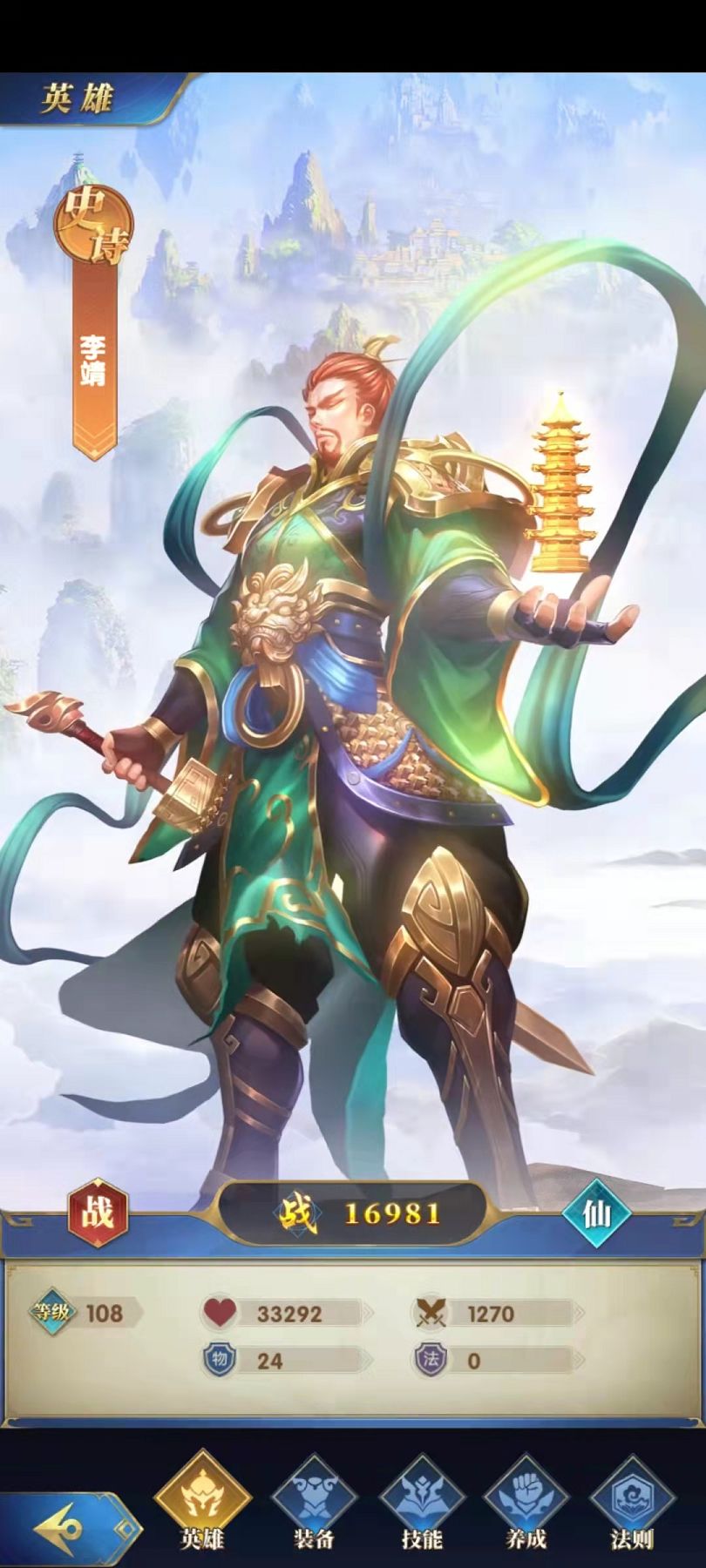 如果说牛魔王是一个既有防御又有输出的英雄,那么李靖则是一个纯肉的角色,主动技能护身宝塔,可以为己方所有的友军施加一个护盾,抵消很多伤害。被动技能虚无,在开始战斗的时候,李靖可以使敌方攻击力最高的角色进入虚无状态,被虚无的目标无法攻击,也不会受到伤害,相当于废掉了对方一个输出最高的点。这样前排有了牛魔王和李靖前期。会非常顺畅。