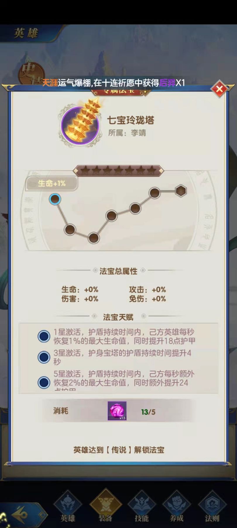 英雄晋升需要的灵魂石主要通过召唤来获得,第1个途径就是在唤灵殿使用召唤卷和钻石进行普通唤灵,随机获得英雄的灵魂石。再就是通过祈愿券来获得指定英雄的灵魂石,后期想要专一培养某几名英雄,就需要通过祈愿券来获得。当英雄达到能够获得法宝的品质之后,下一步需要进行的就是法宝的强化,这才是后期最重要的工作。每一个法宝最高拥有7颗星,每提升一颗星都可以解锁对应的属性和专属技能。