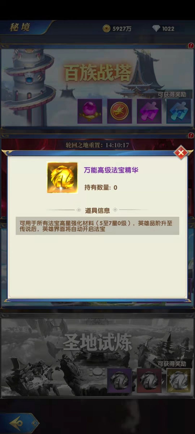 法宝的升星消耗的是法宝精华,法宝精华分为三个层次,分别是初级,中级和高级法宝精华。按照作用又分为专属法宝精华和万能法宝精华,万能法宝精华很好理解,就是可以用来提升任何英雄的专属法宝。目前可以获得法宝精华的活动主要就是圣地试炼,需要在主线任务通关第10章之后解锁。这些这是一个难度比较大的活动,所以大家需要完成前期的其他强化任务之后才能够去挑战。获得了法宝精华之后,选中想要提升的英雄法宝,然后点击强化就可以了。