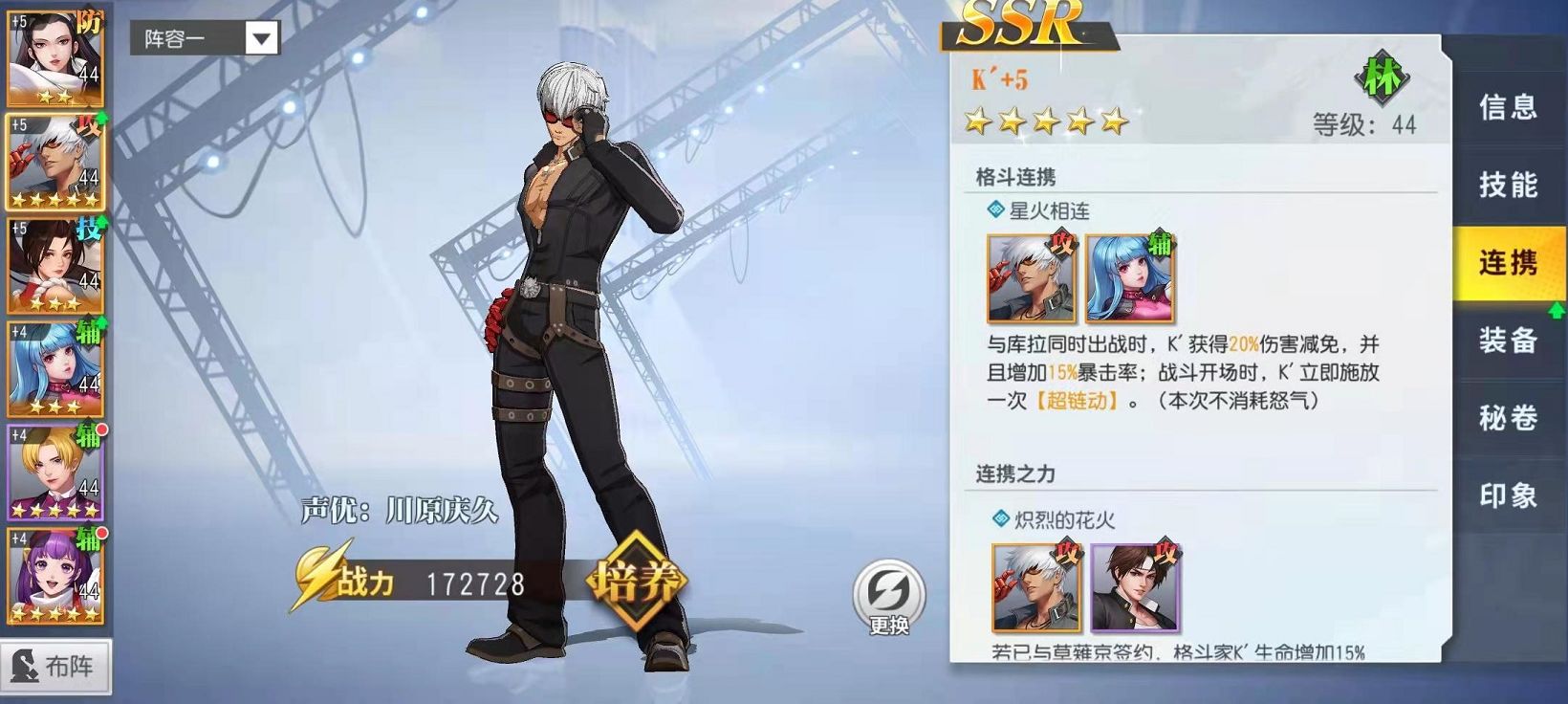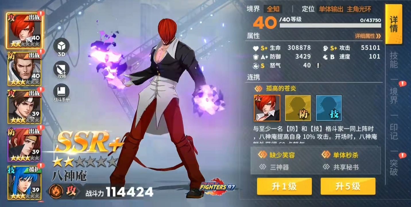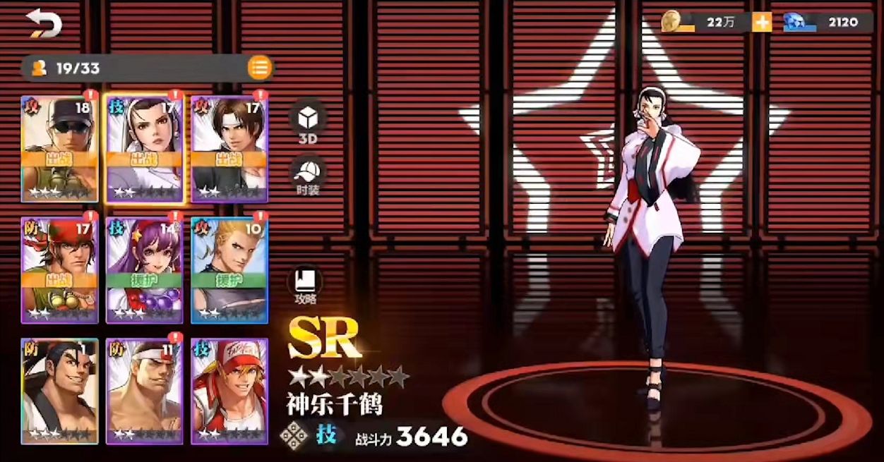 K神和八神庵不同,K神擅长的是群体伤害,自身的奥义技能可以对敌方造成属性伤害加真实伤害。并且每使用一次奥义技能就可以叠加一次伤害提升效果,如果己方有格斗家阵亡,那么K神还可以继承阵亡者的怒气,所以越到后期K神的输出越猛。而在前排神乐千鹤的硬度非常高,自身的怒气攻击技能零技之础可以对敌方全体格斗家造成伤害,并且有几率附加沉默效果,对敌方的输出限制很高。神乐千鹤的被动技能效果是当同一排的队友生命值低于百分之三十五的时候,可以附加抗爆率提升,并且免疫一次被击退攻击的效果。