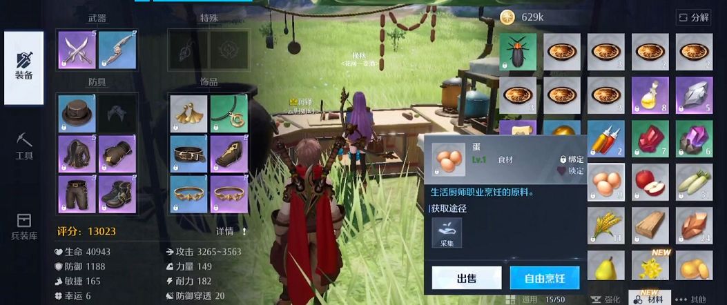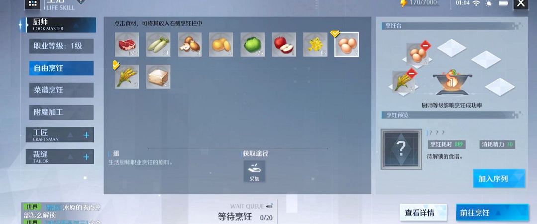 至于蛋类的话大家可以传送到捕猎点,有专门的飞禽点可以让玩家们使用弓箭等武器猎杀,如果能找到鸟窝的地方那么就是鸡蛋所在的地点,来到烹饪台之后选择合适比例的烹饪材料点击加工即可,总共需要耗费六秒钟的加工时间。