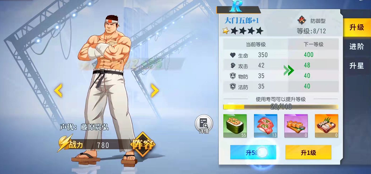 4、阵容玩法:前期阶段可以考虑先把嘉神慎之介放在后排来担任队伍的主要输出手,这样可以提升前期输出。后期队伍成型后灼烧伤害和怒气回复都得到提升,此时爆发和持续输出就都有了。