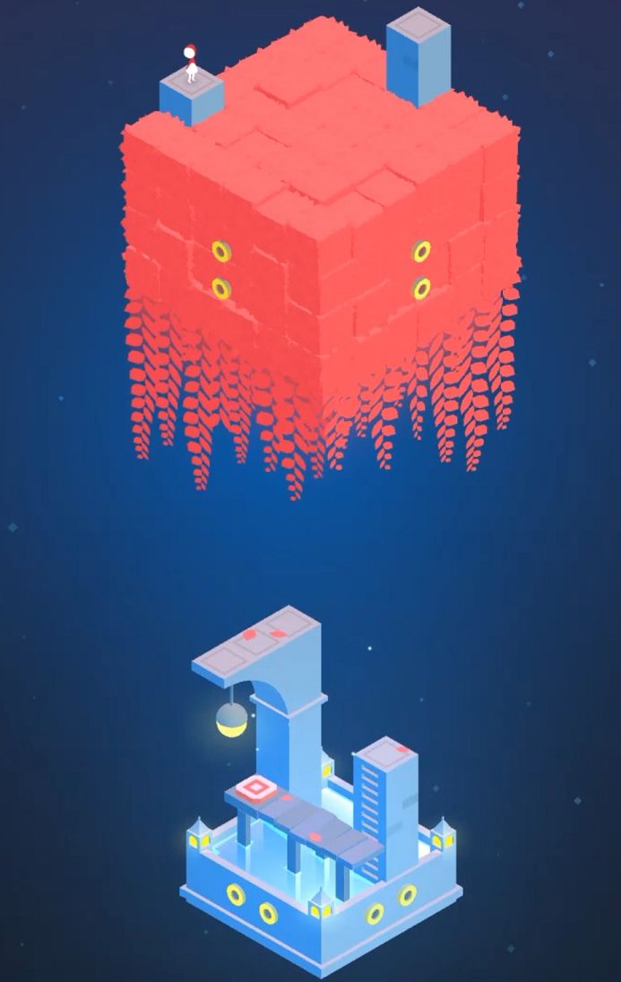 第十一章:来到第一个场景,玩家要先移动红色建筑,让其成为桥梁,操控小人通过,再次移动建筑,小人就能到达门处。第二个场景,第一步先上楼梯,转动轴承,移动建筑,让小人先上固定建筑,重复操作,点击按钮,场景变化,玩家又需要转动轴承,让小人能够按另一个按钮,然后玩家就可以从传送门直接传送至终点门所在地了。