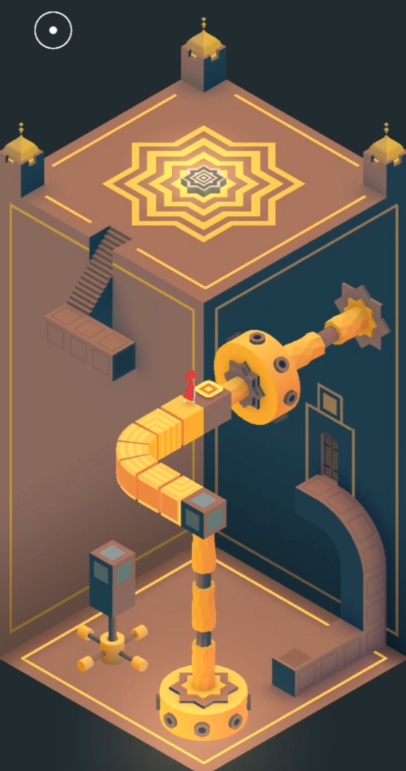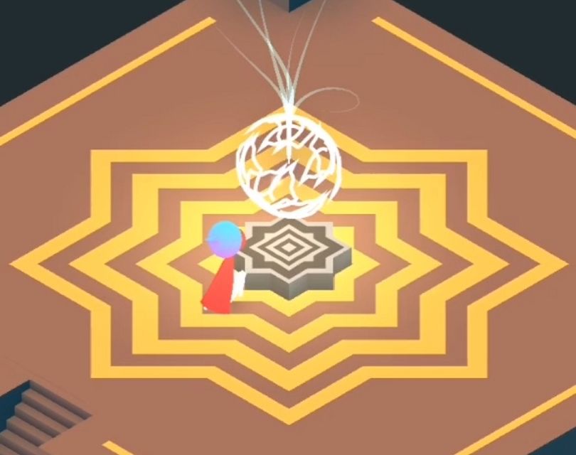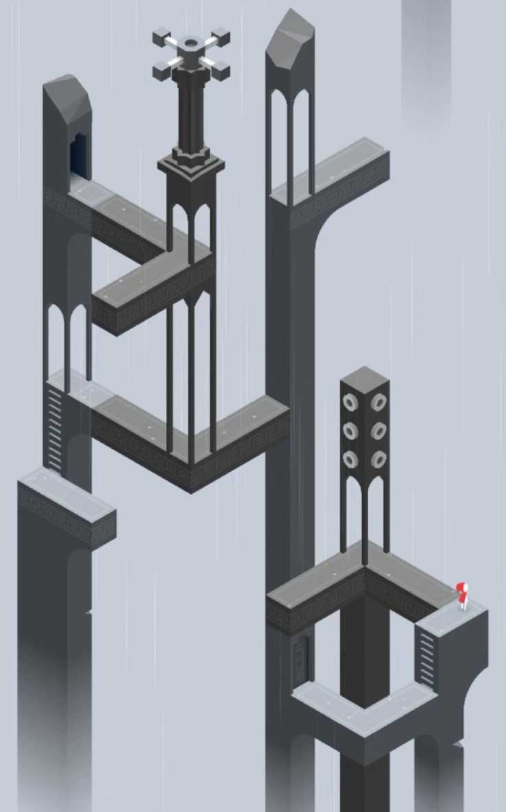 场景三先将建筑转成下图这个样子,接着进入传送门,小人会从中间一层的门出来,再次旋转建筑,组成楼梯,使小人可以向上攀登,最后三次旋转可以带领小人进入最终的门啦!场景四中的凸弧形墙与凹弧形墙都是可移动的,先利用凸墙移动到前侧灰色按钮处,再到另一个按钮处,图腾出现,本章完结。