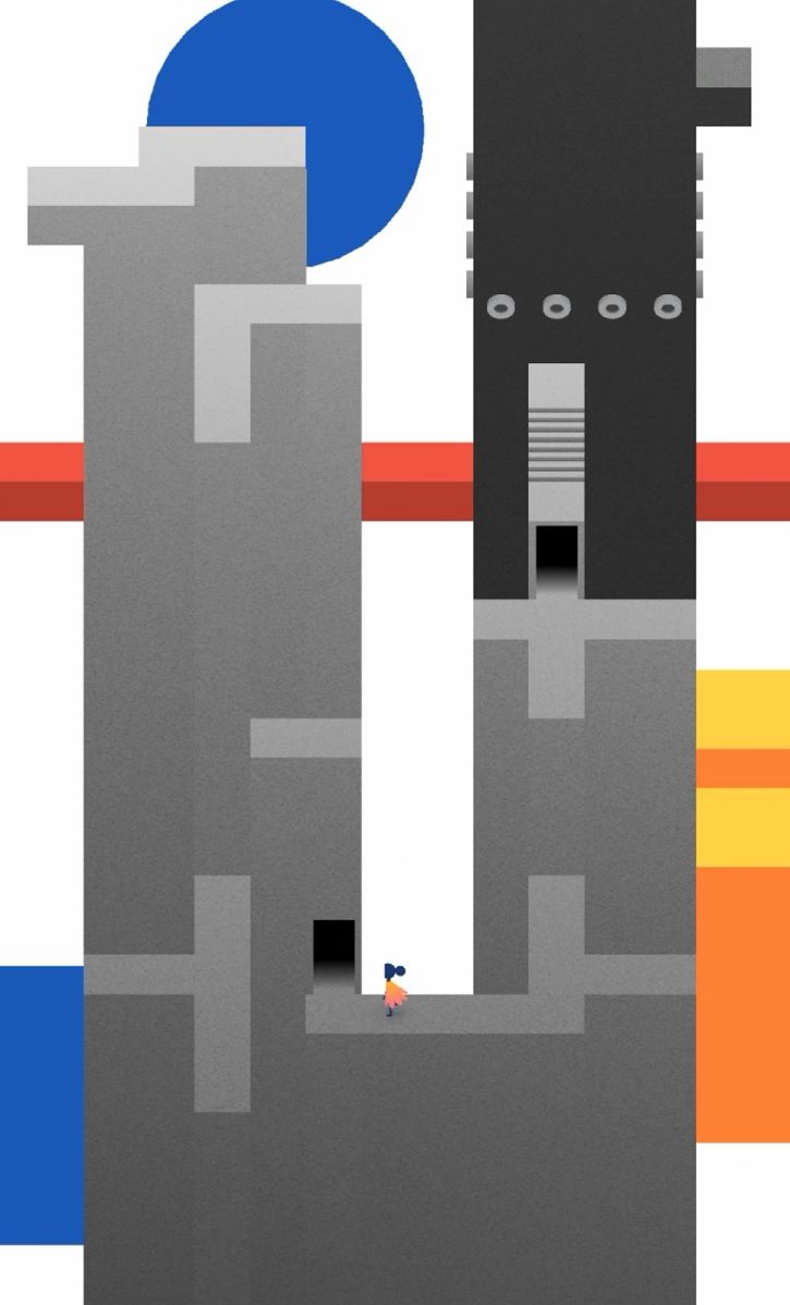 第三个场景,先将建筑搭成如上图所示,接着再移动两次这个建筑,就能到达门里了。到达新场景后,先转动轴承,让建筑变成下图所示的样子,然后向上移动建筑,小人走到移动建筑上,上升建筑,小人即可来到门处。在过渡场景中,玩家可以直接让萝尔去接触发光小人。最后一个场景中有着一排长条移动建筑,玩家要把它摆平,直接前往图腾,通过这篇章节。