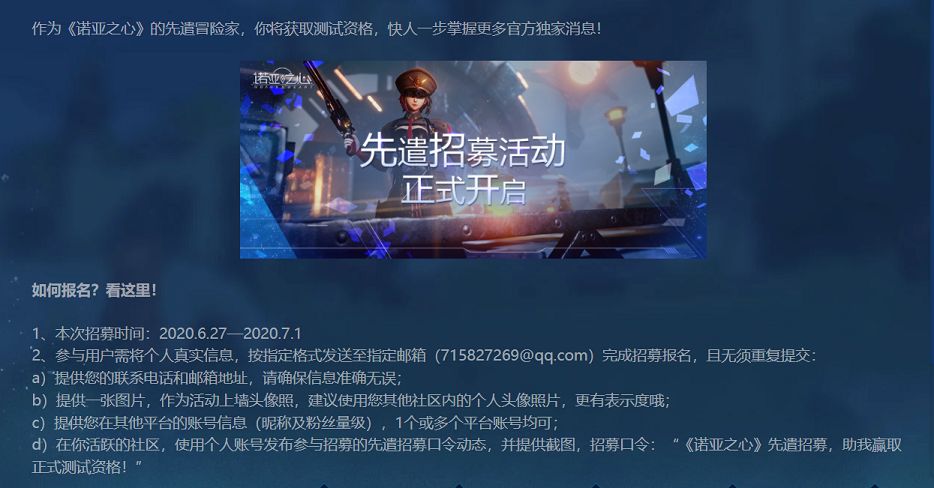 这也是诺亚之心游戏首次面对游戏界公开招募测试玩家,所以对于玩家的资质要求比较严格,除了真实的个人信息之外,联系电话和邮箱地址以及招募口令截图都需要提供,这样才能获取第一次测试的邀请码。