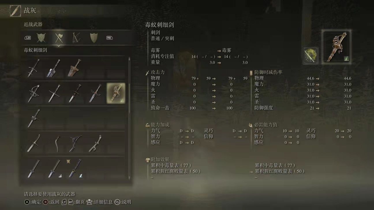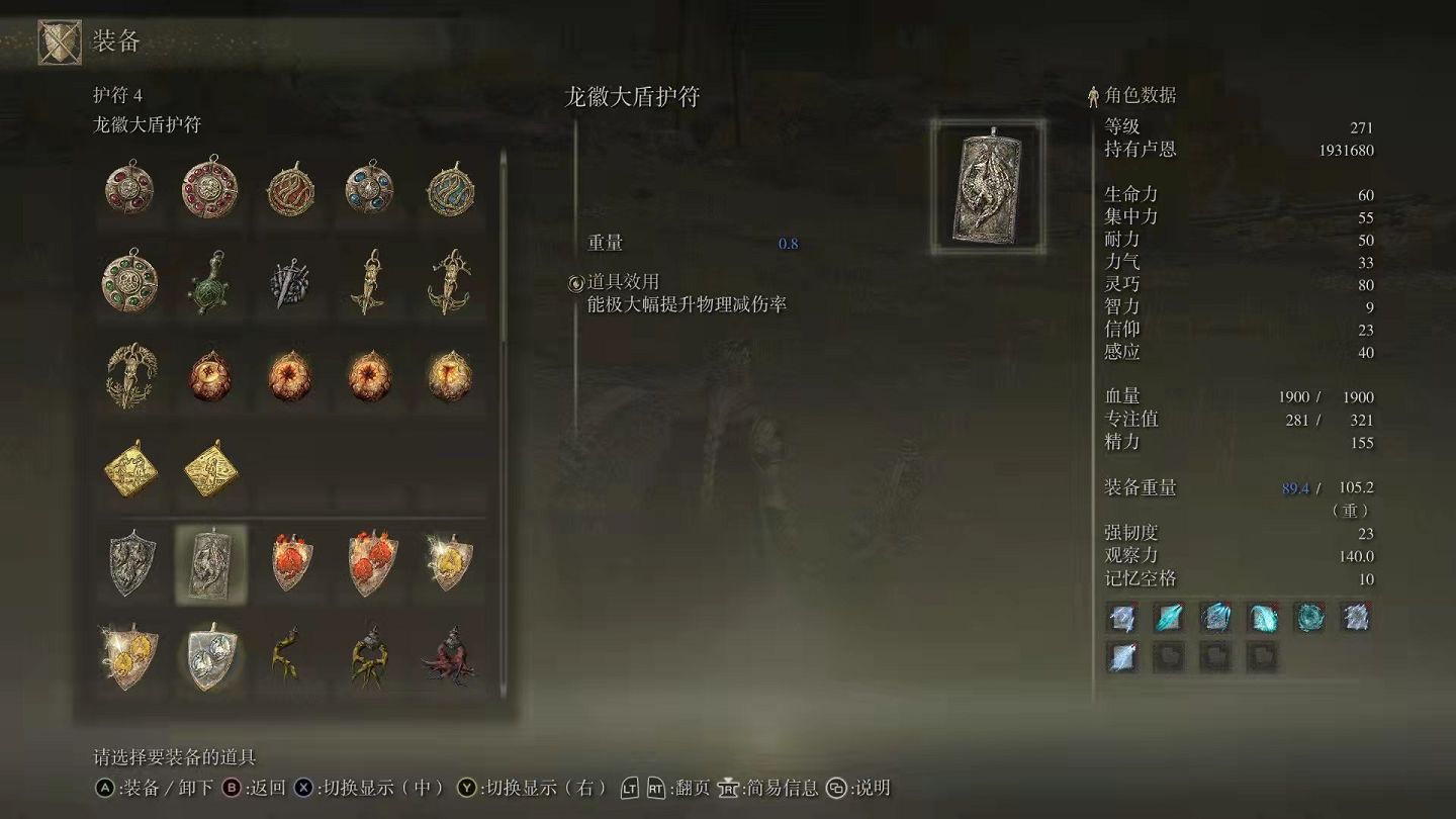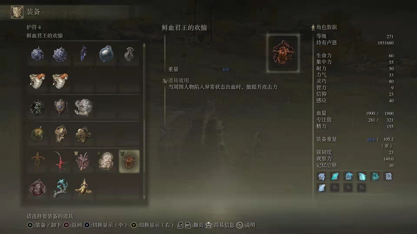 山羊套、指石纹盾、龙徽大盾护符、大盾护符、鲜血金旺的欢愉、夏波利利之祸、血蚁刺剑、出血矛、仿生骨灰,其中仿生骨灰和鲜血君王的欢愉可以不带,山羊套和指石纹盾可以找类似的替代品。出血矛的冻伤有着锦上添花的作用,实在没有可以舍弃。