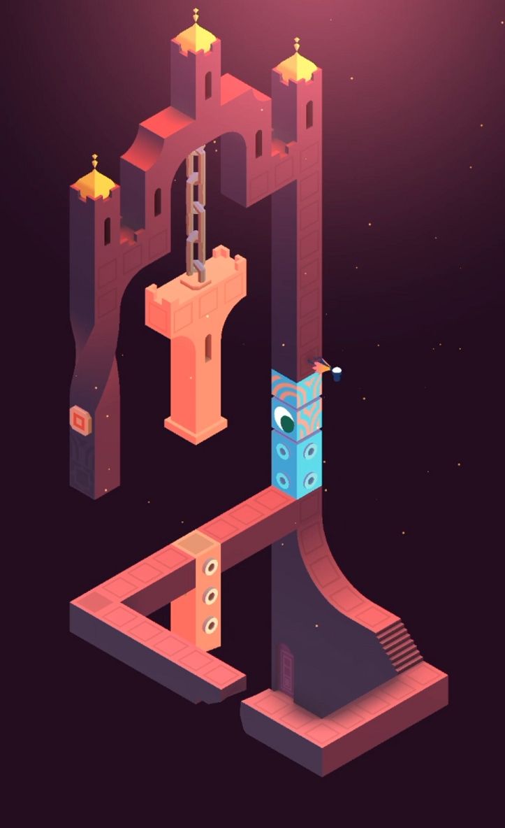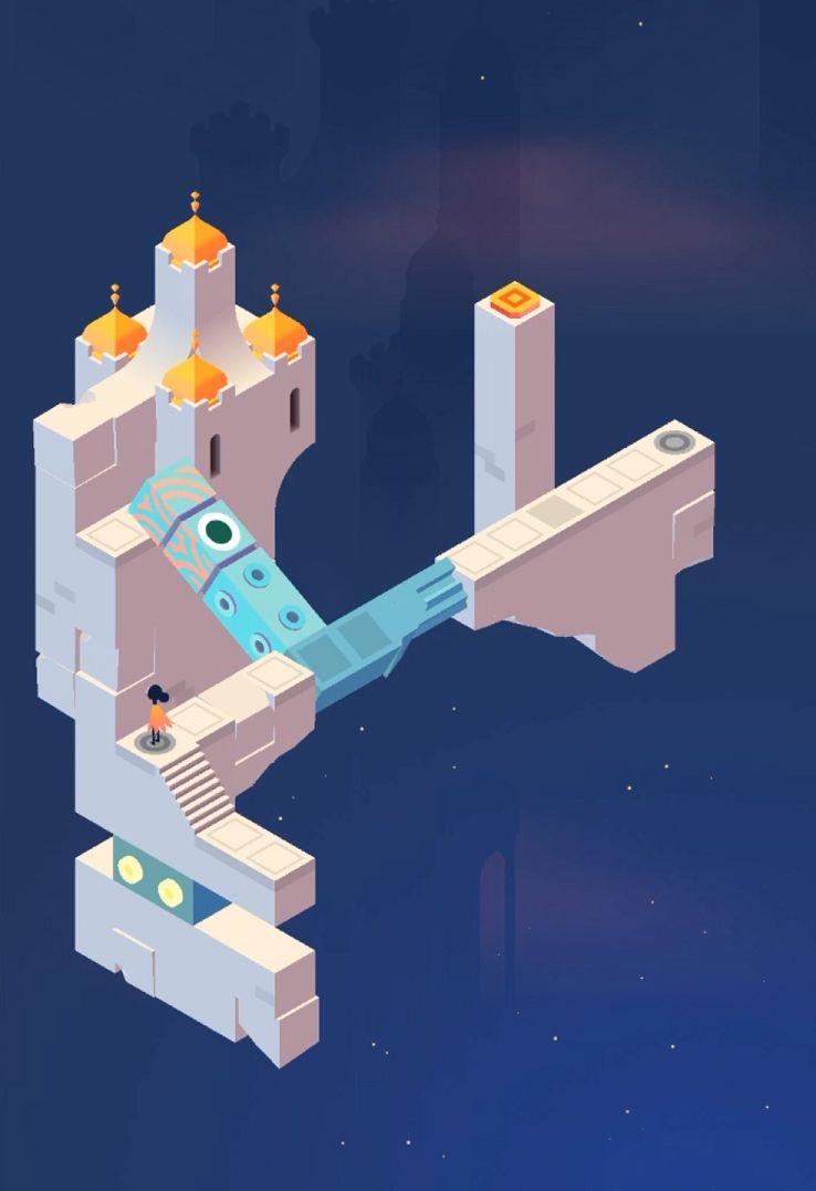 在这一场景中,玩家将方柱移动到蓝色的桥梁上,再通过移动下方的两孔墙,从而使得方柱可以转动成如下图所示的桥梁,再移动方柱,让小人站在它的上头,接着柱子又再次上升。