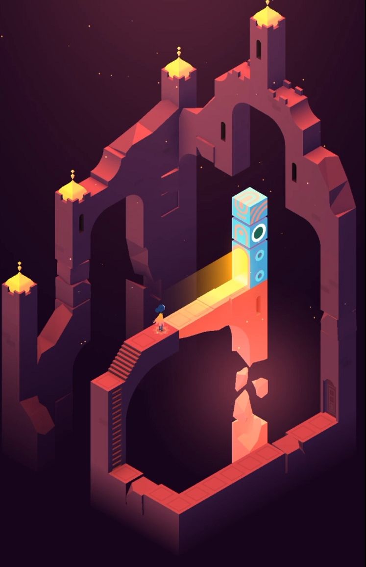 玩家会随小人一起降临到纯白色的建筑中,按住前方的白色小按钮,点亮中心的建筑,楼梯会自动下来,然后玩家点击门就行了。来到第二个场景,控制可以移动的、长着眼睛的方柱,让小人乘坐着它来到第二层,将方柱摆至如下图所示的样子即可。让小人走到下方楼梯处,将方柱移到旁边后,就可以点击门,带领小人进入啦!