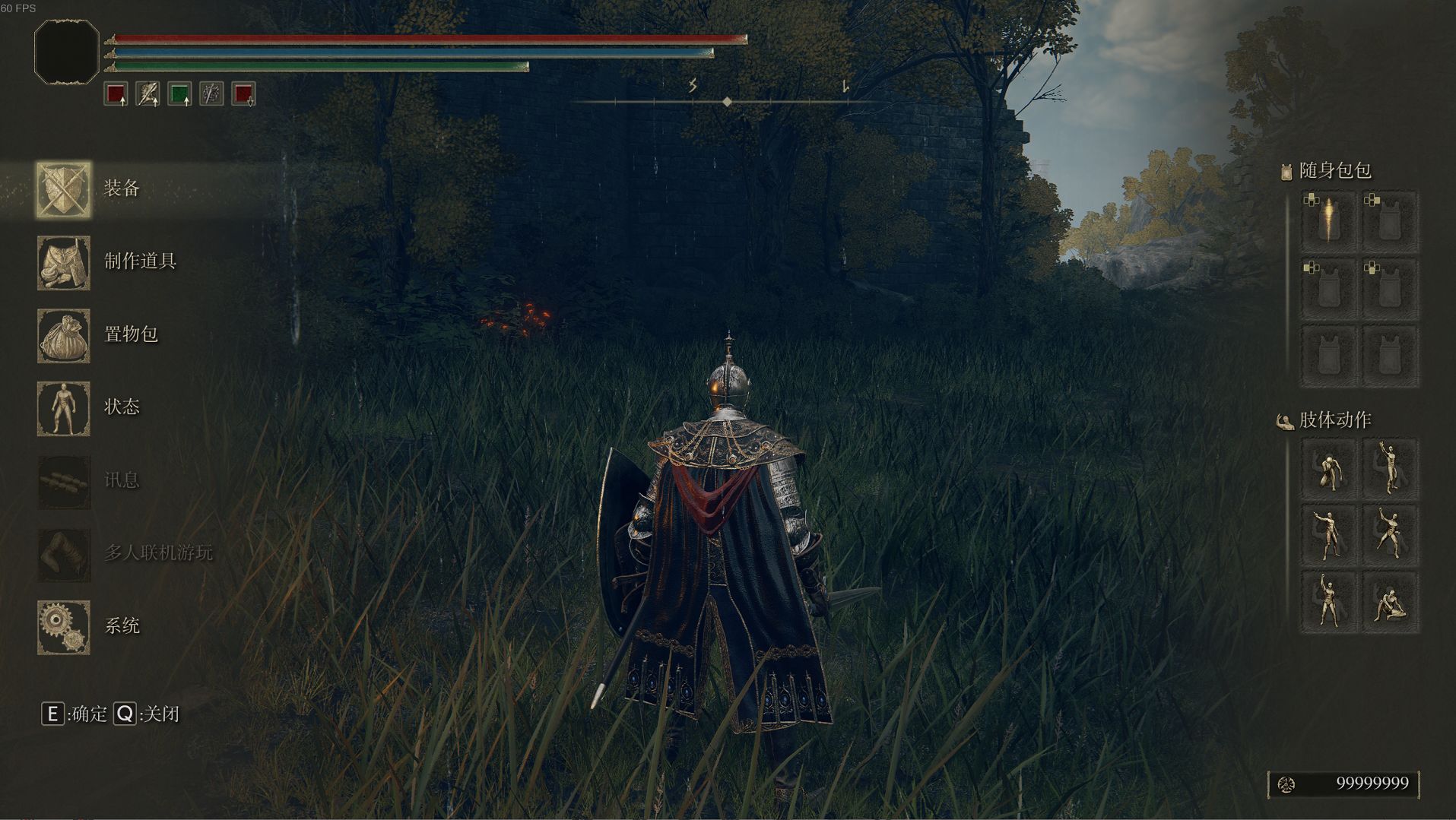 首先我们进入PC端之后可以知道不同的方向键可以更换不同的祷告、魔法、武器和道具,所以我们就需要调整背包中的道具来达成更换不同的药物的目的。首先玩家们通过购买或制作等途径可以获得很多种类的道具,其中有各种buff药物、骨灰和马匹等,更换道具就需要首先按下ESC按钮,之后在弹出的窗口中点击左上角的装备。