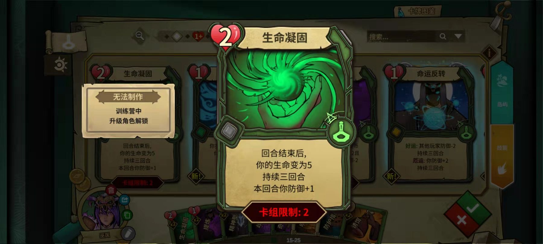 其实在效果上,生命凝固和生命汇聚非常相似,生命汇聚可以在回合结束后使生命变为7点,持续三个回合。生命值多了两点,但是少了一点防御,所以在最后搭配的时候小编还是选择了生命凝固。因为这一点防御在很多时候效果要超过2点生命值。再就是生命汇聚是三费卡牌,而生命凝固是二费。而锁血的卡牌小编认为有这两个还不够,所以就搭配了一张生命激活,效果是在回合结束后,如果当前的生命值小于4点,那么就可以直接变为4点,一直到生命值大于4点为止。这样这三张卡牌就形成了4点,5点和7点,三个不同的锁血层次。