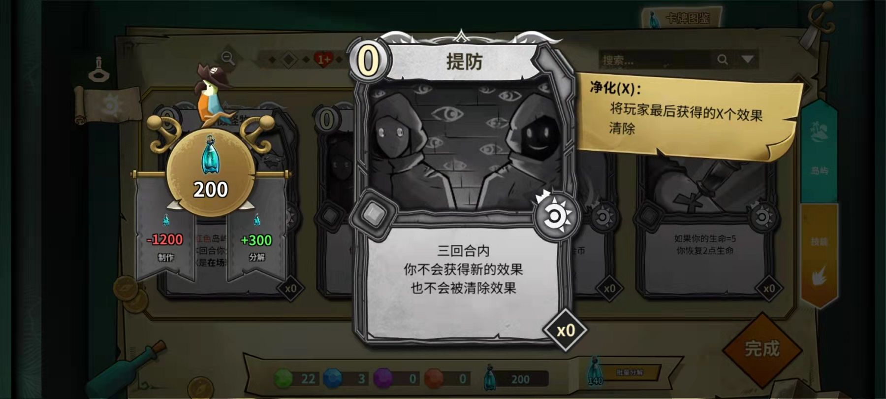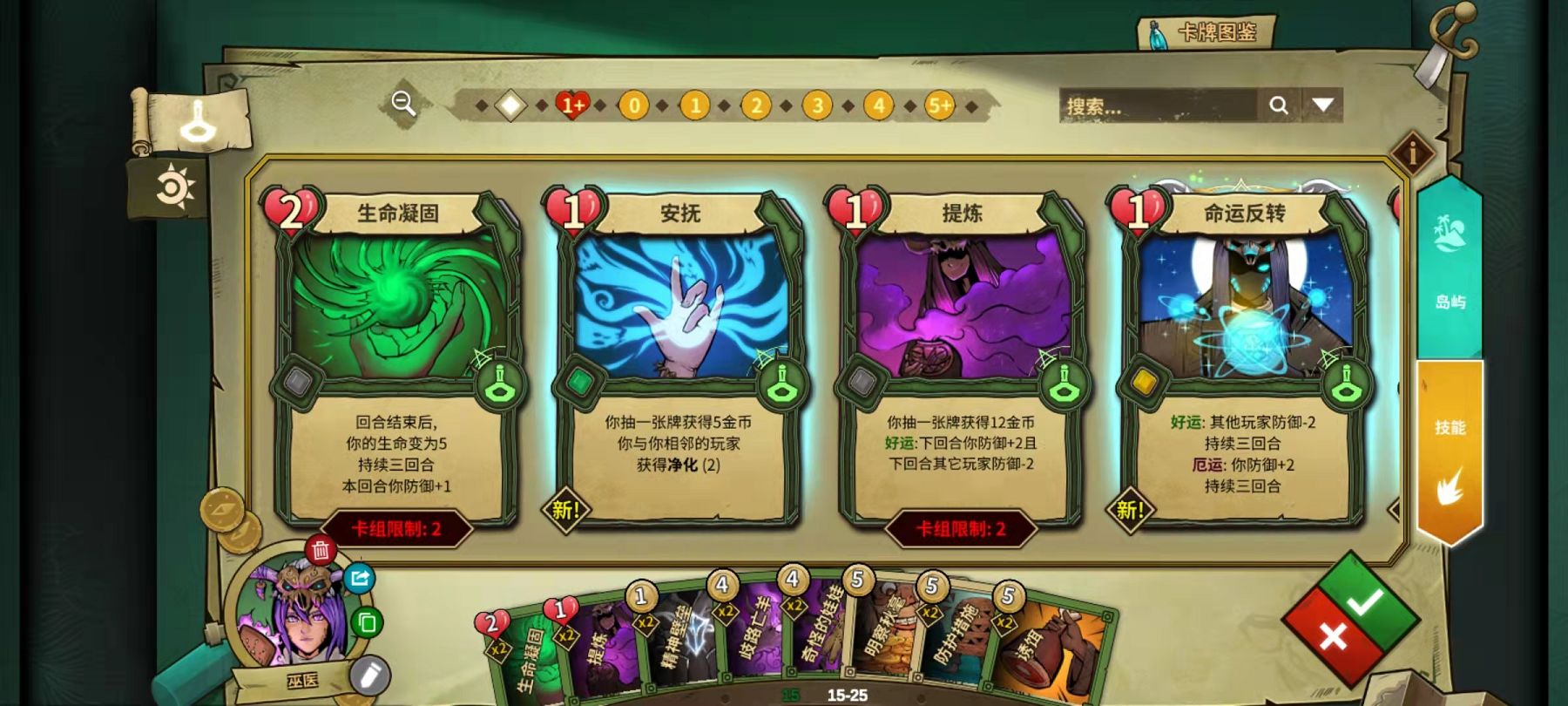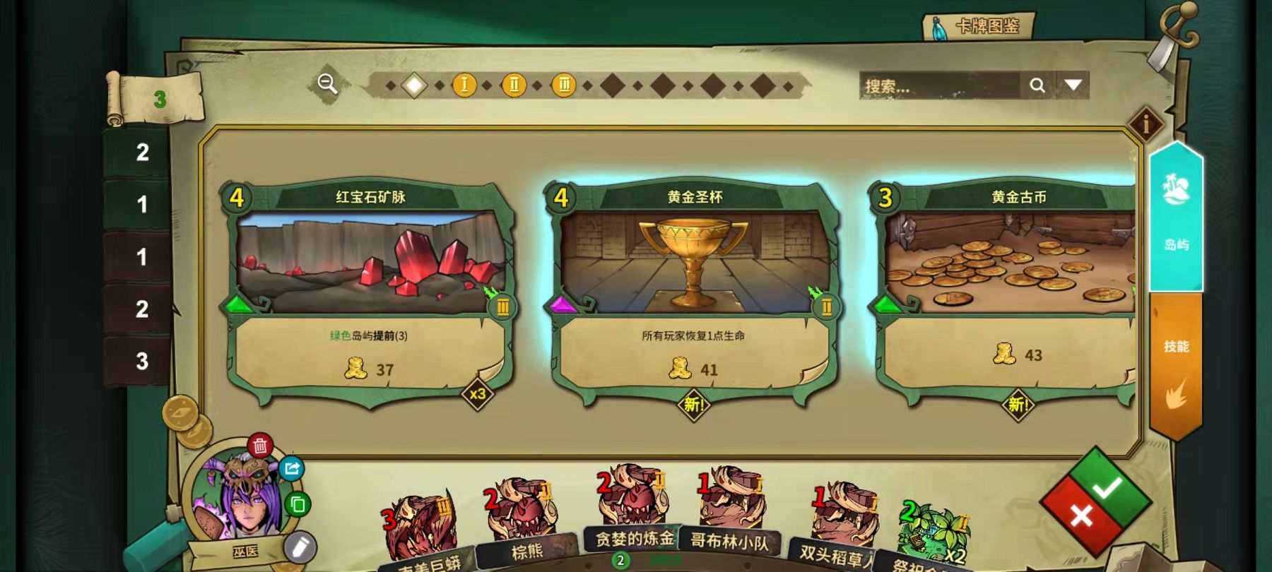 堤防这张卡牌非常有意思,它的效果是在三个回合内玩家不能获得新的效果,但是已有的效果也不会被清除。当我们获得金币数量最多移到最右边的时候,同事身上带有锁血的效果,可以使用这张卡牌提前进行一个预判。和提防正好相反,福祸相依这张卡牌是使我们的位置在最左边的时候,可以使出来进行预判,防止对方进行减防。最后再来给大家介绍一下岛屿卡的搭配,红色岛屿建议选择三攻以下没有其他效果的岛屿,绿岛的话选择钱岛就可以。