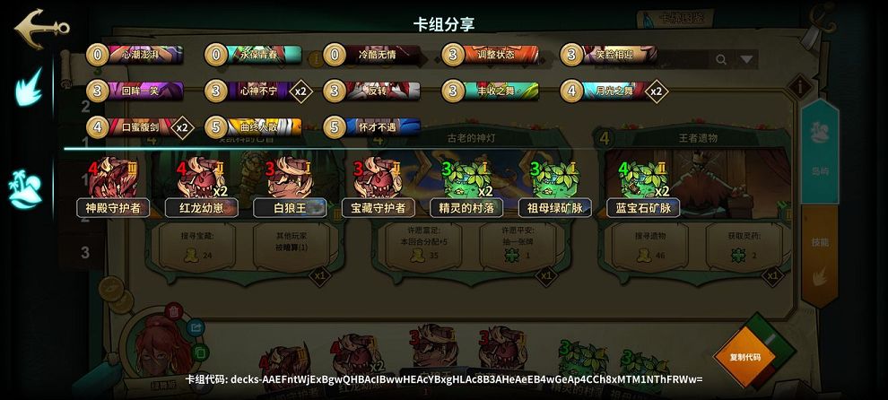 1、卡组组成:心潮澎湃、永葆青春、冷酷无情、调整状态、笑脸相迎、回眸一笑、心神不宁X2、反转、丰收之舞、月光之舞X2、口蜜腹剑X2、曲终人散、怀才不遇;神殿守护者、红龙幼崽X2、白狼王、宝藏守护者、精灵的村落X2、祖母绿矿脉、蓝宝石矿脉X2。