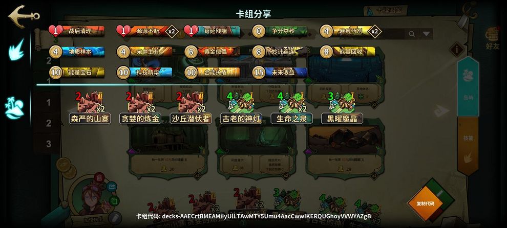 1、卡组组成:战术清理、源源不断X2、苟延残喘、争分夺秒、麻痹药剂X2、地质样本、无中生有、黄金傀偶、妙计连连、能量回收、能量宝石、科技精华、金能护盾、未来收益;森严的山寨X2、贪梦的炼金X2、沙丘潜伏者X2、古老的神灯、生命之泉X2、黑曜魔晶。