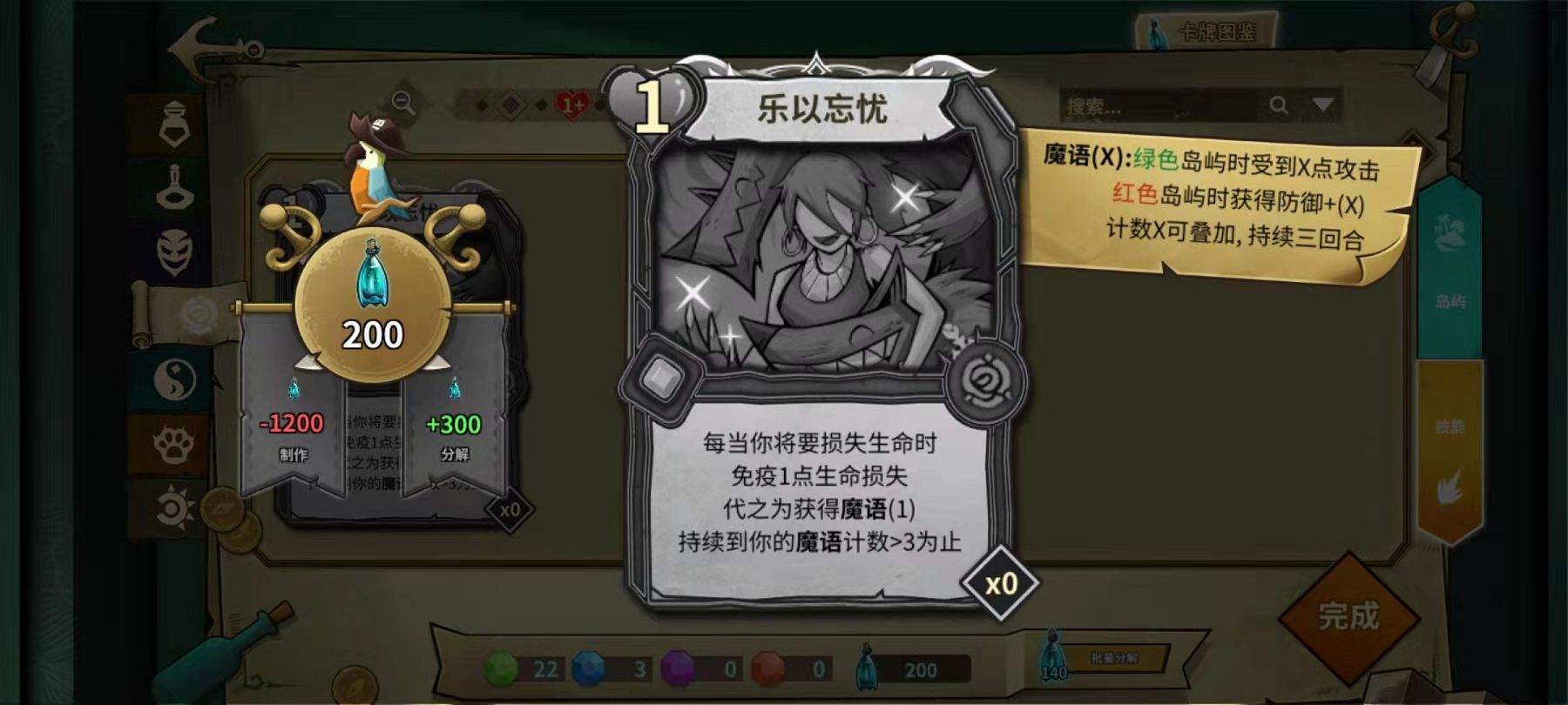 在卡牌搭配上小编选择的是以乐以忘忧这张卡为核心,搭配上堤防,自律,心神不宁,圣洁之舞,反转,丰收之舞,曲终人散,一呼百应,貌合神离和大难临头这些卡牌组成一个15张卡牌的手牌组合。乐以忘忧这张卡牌的效果是当要损失生命值的时候可以免疫一点伤害,同时获得魔语效果。魔语的效果按照不同的岛屿来分,当是绿色岛屿的时候会受到攻击,红色岛屿的时候获得防御,并且魔语的效果可以叠加,受到的伤害和获得的防御会随着层数的叠加而同时叠加。