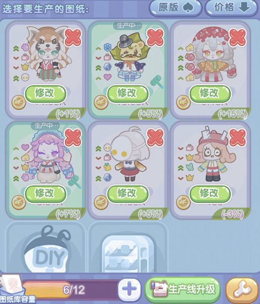 想要更改设计图纸,我们需要点击窗口右下角黄色的扳手标志,点击之后我们就能够对设计图纸进行删除以及修改的操作。游戏中设计图纸是有上限的,通过消耗偶币就可以提升设计图纸的上限。点击设计图纸后方的去DIY就能够创建新的图纸,在图纸库容量富余的情况下,我们推荐大家优先创建新的设计图纸,而不是修改原有的。