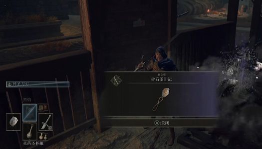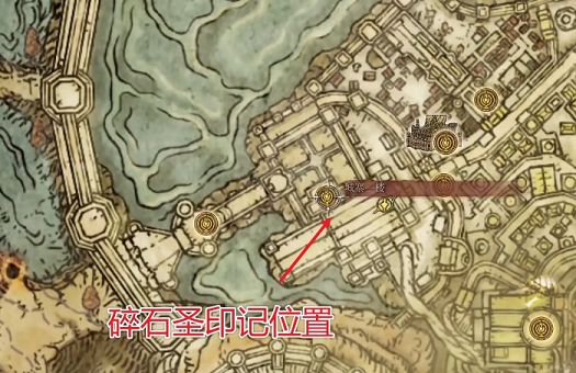 碎石圣印记:先来到城寨一楼的赐福点,出门口往左走,这里可以看到一个举盾拿长矛的敌人,远处还有一个弓箭手。把长矛兵引过来击杀,击杀之后就可以搜刮获取碎石圣印记了。
