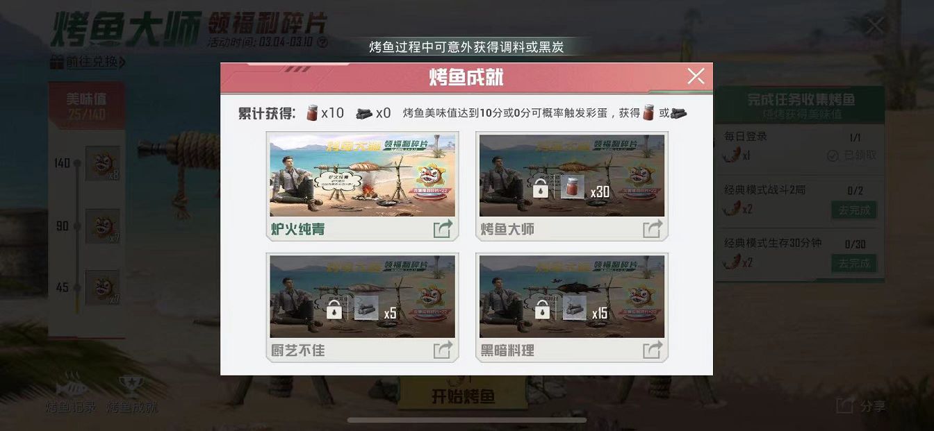 炉火纯青:需要玩家进行烤鱼,并且达到10评分就可以轻松获取了。