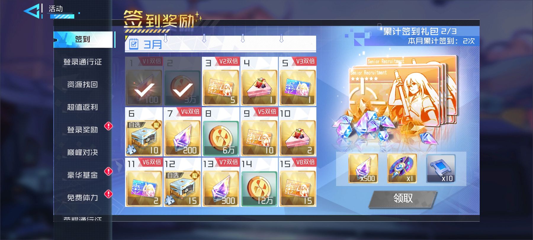 我们首先进入游戏,然后在主界面的游戏画面右下角有一排提示栏,包括:福利、补给、回收、商城等选择框,小伙伴们点击福利卡框就可以进入福利界面,在这里有每日基础的签到、游戏通行证、充值返利、连续登陆获得奖励、基金和每日体力赠送等内容,小伙伴们每天一定要记得在这里领取各种奖励哦!那么小伙伴们把把左侧的提示框滑动到最下方可以看到一个兑换码字样。